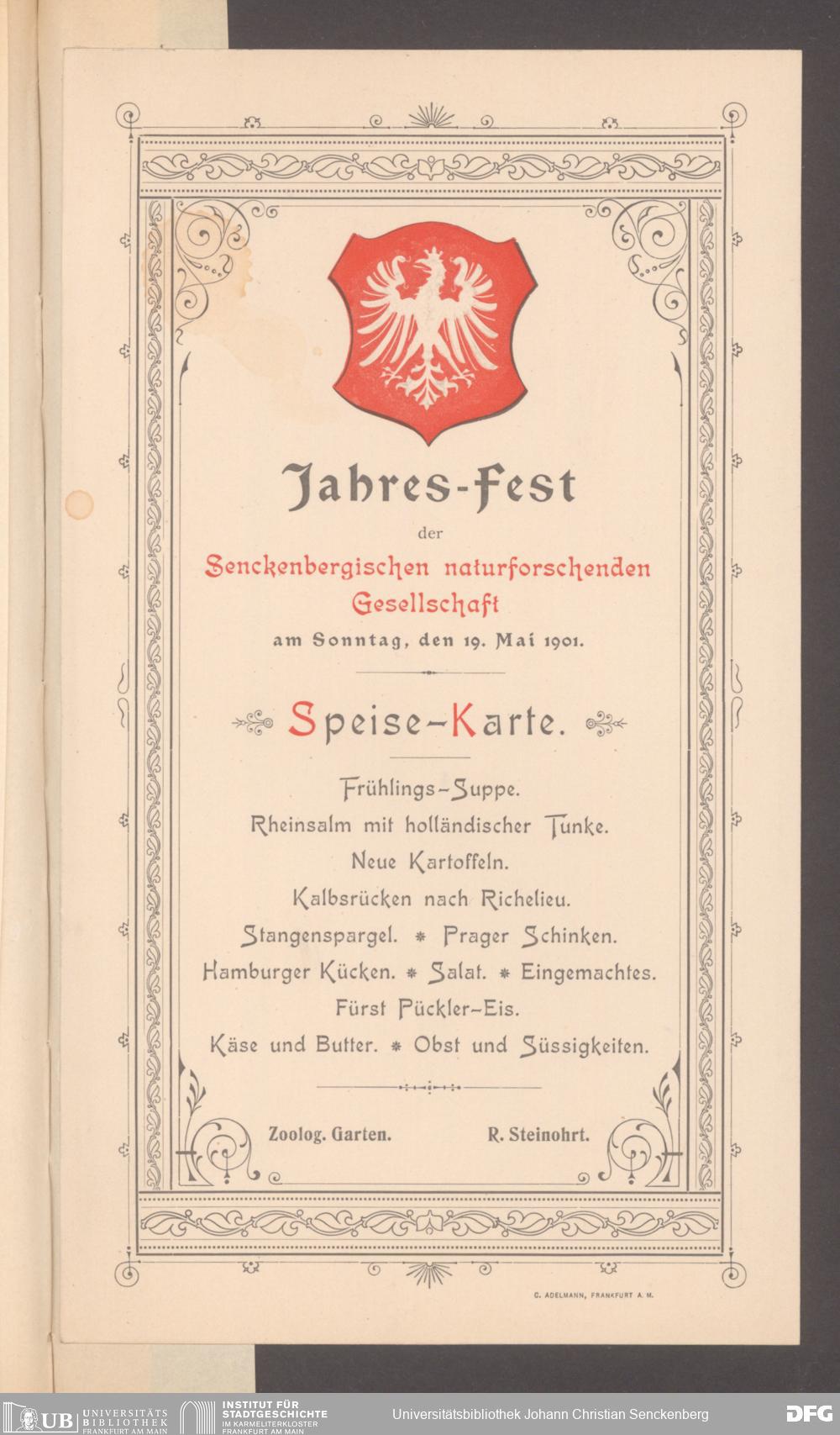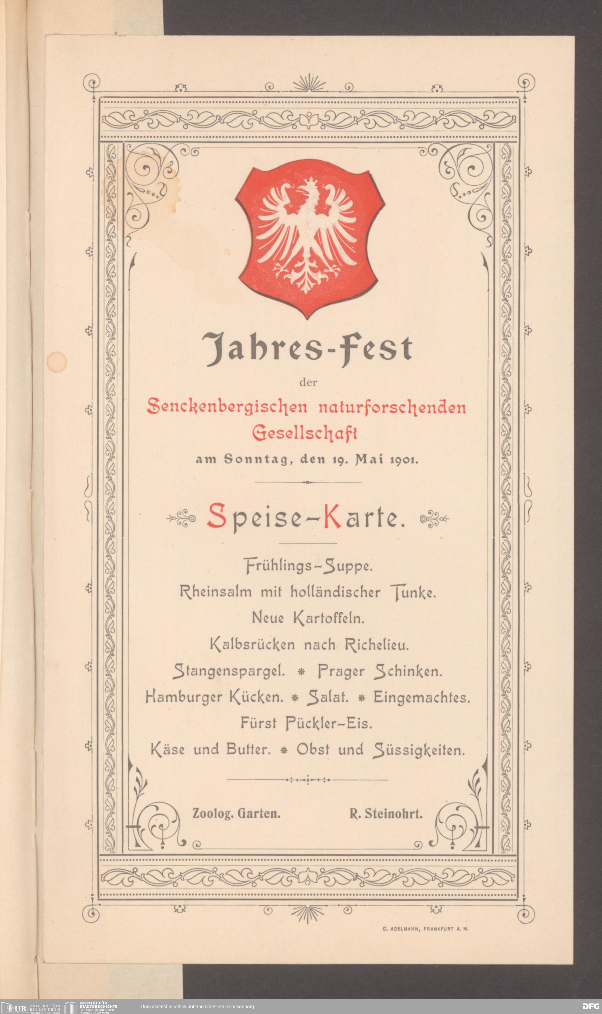 V176 Senckenberg Gesellschaft für Naturforschung, 497 - Eintrittskarten, Lieder- und Programmhefte sowie Speisekarten von Jahresfeiern, Doktorjubiläen und der Feier zur Eröffnung des Museums
