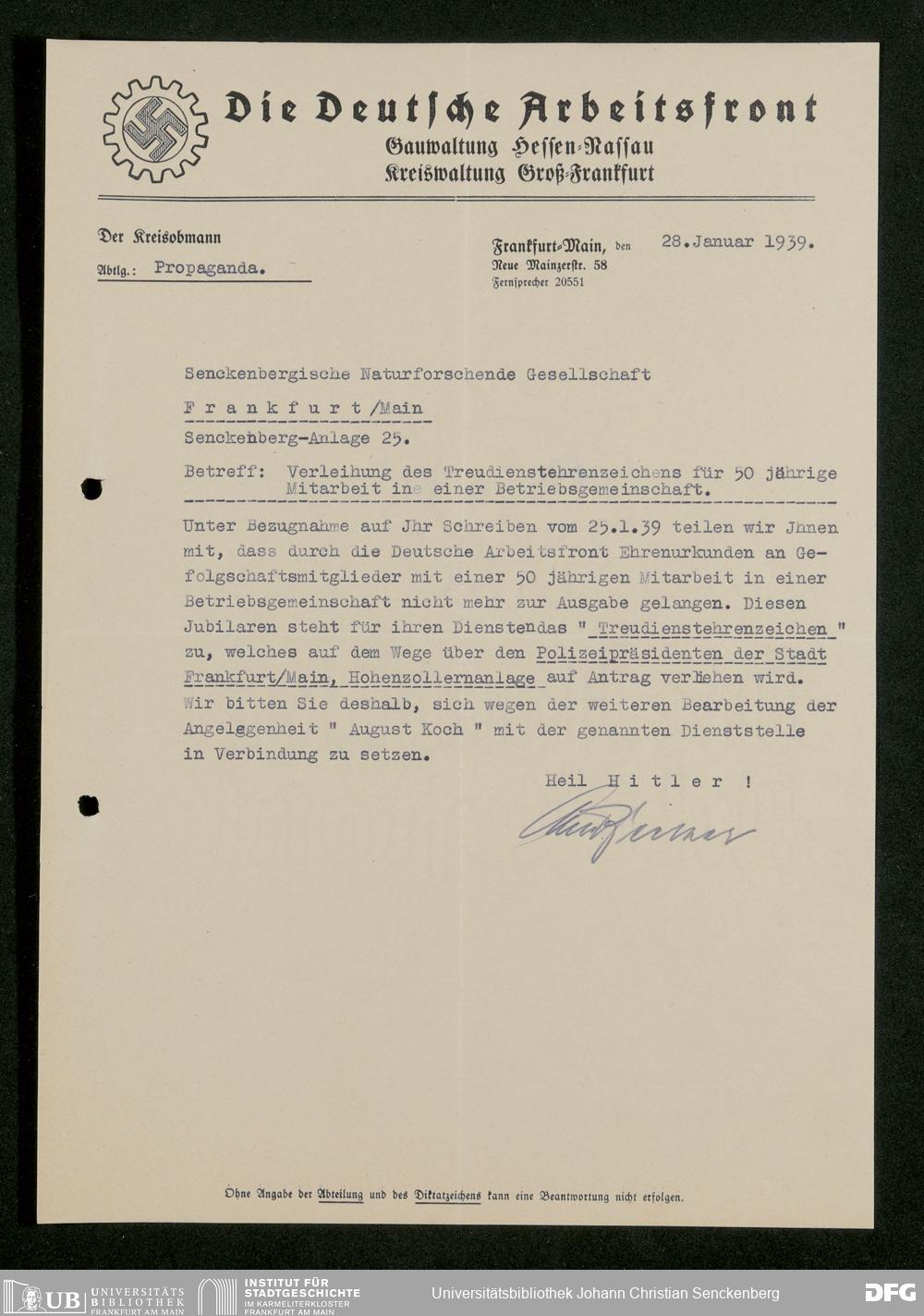 V176 Senckenberg Gesellschaft für Naturforschung, 514 - Bemühen der Senckenbergischen Naturforschenden Gesellschaft um Würdigung der Dienstjubiläen ihrer Mitarbeiter durch die Deutsche Arbeitsfront