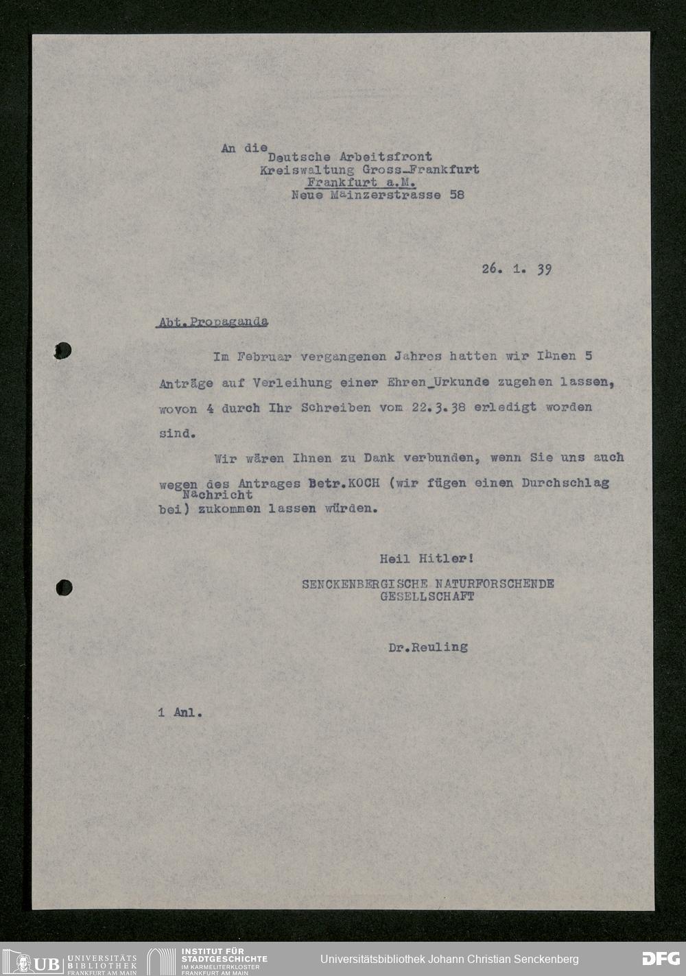 V176 Senckenberg Gesellschaft für Naturforschung, 514 - Bemühen der Senckenbergischen Naturforschenden Gesellschaft um Würdigung der Dienstjubiläen ihrer Mitarbeiter durch die Deutsche Arbeitsfront