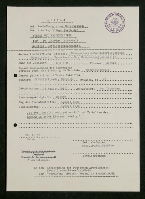 V176 Senckenberg Gesellschaft für Naturforschung, 514 - Bemühen der Senckenbergischen Naturforschenden Gesellschaft um Würdigung der Dienstjubiläen ihrer Mitarbeiter durch die Deutsche Arbeitsfront