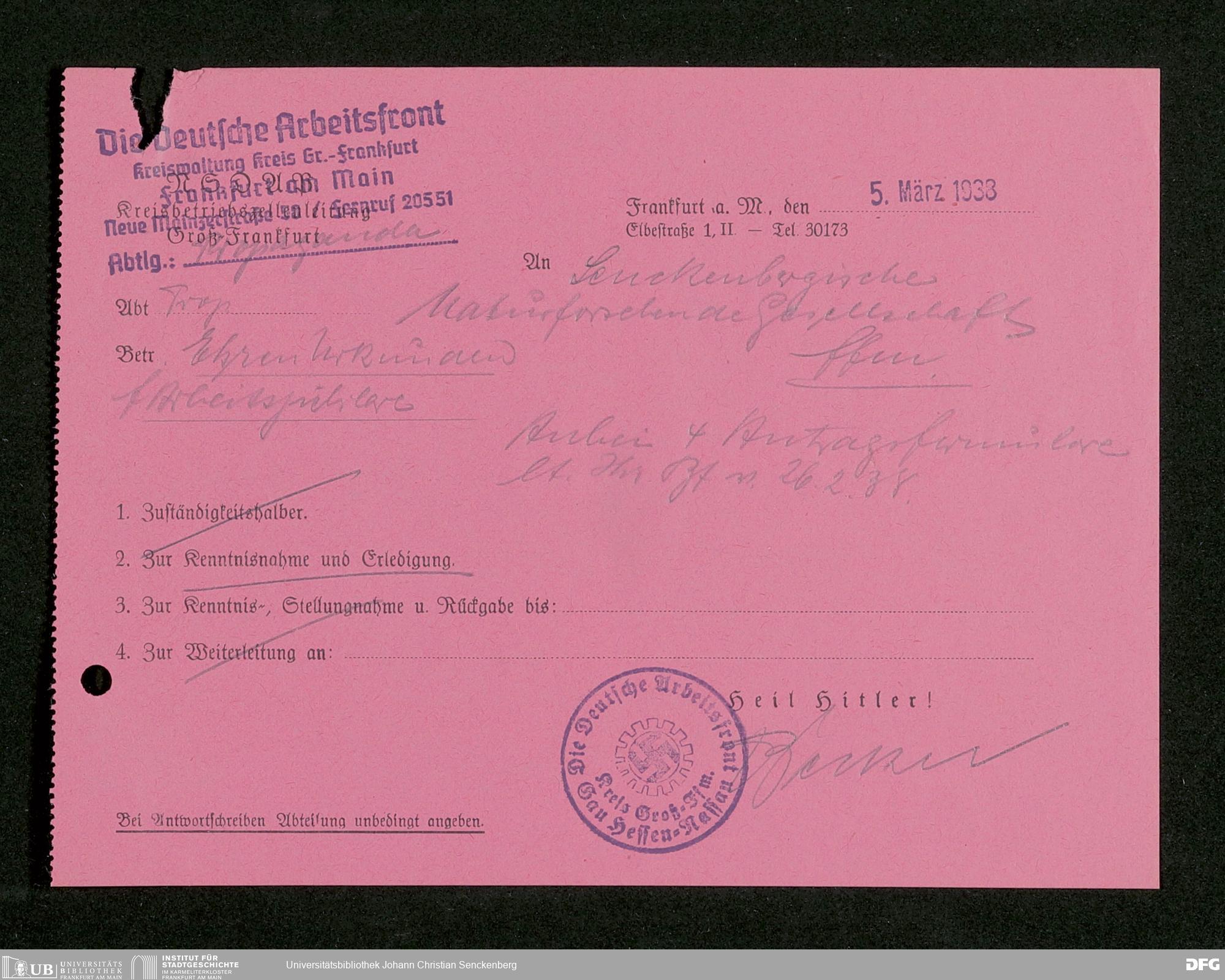 V176 Senckenberg Gesellschaft für Naturforschung, 514 - Bemühen der Senckenbergischen Naturforschenden Gesellschaft um Würdigung der Dienstjubiläen ihrer Mitarbeiter durch die Deutsche Arbeitsfront