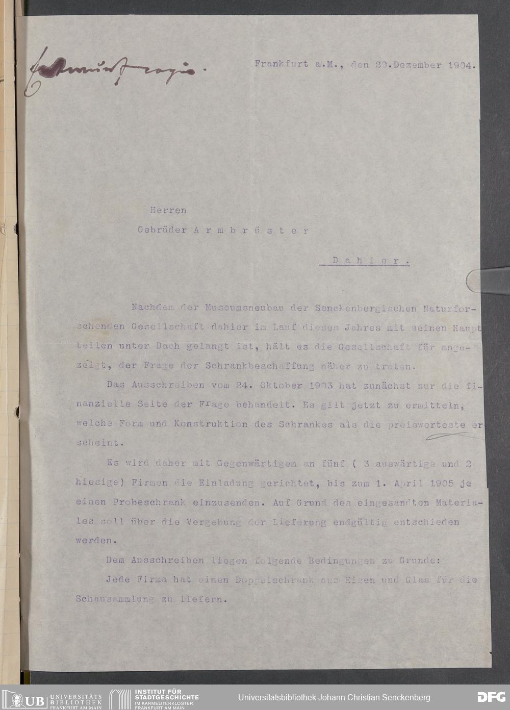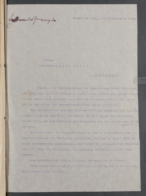 V176 Senckenberg Gesellschaft für Naturforschung, 520 - Ankauf von Museumsschränken bei der Firma Gebrüder Armbrüster