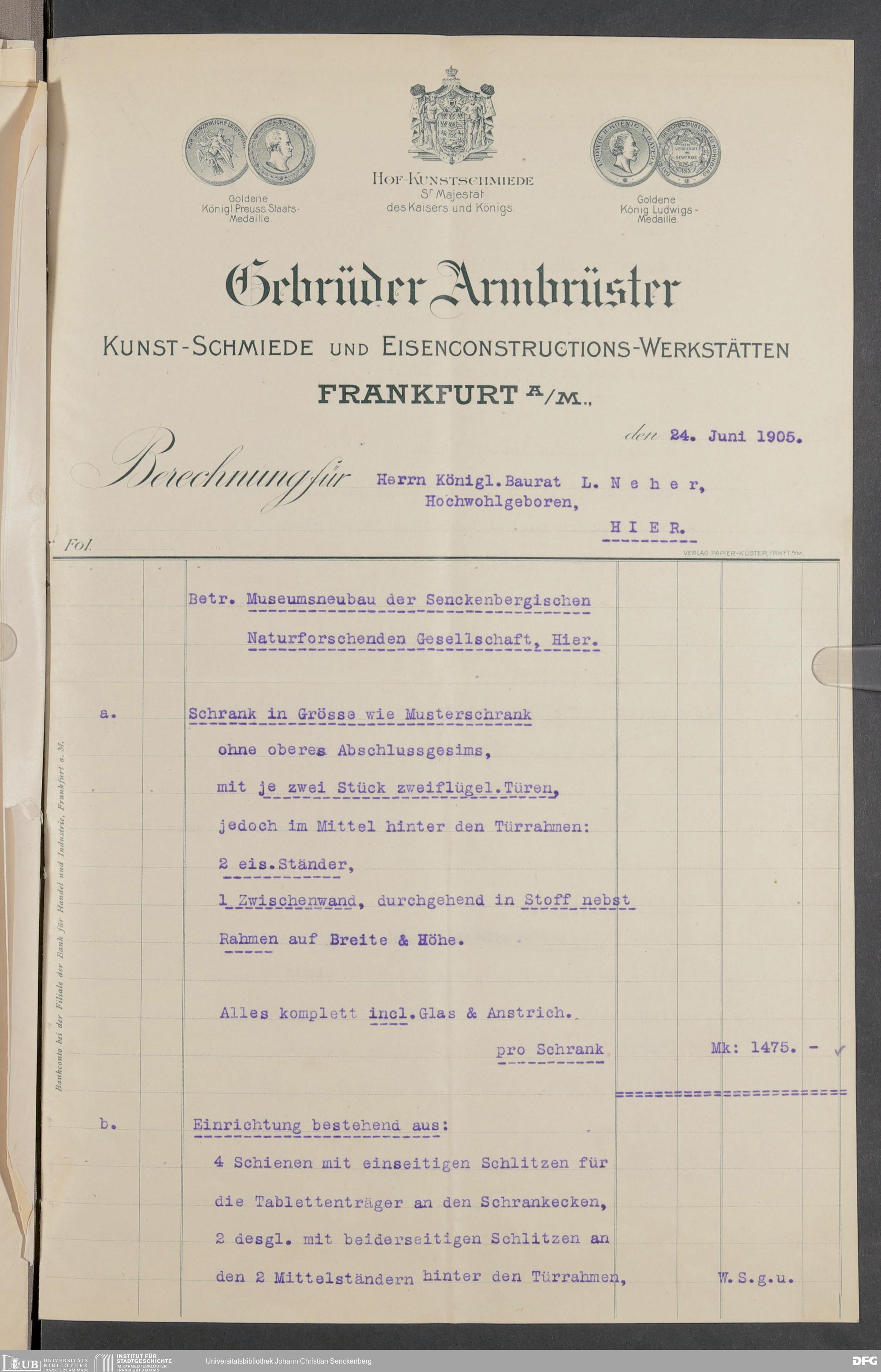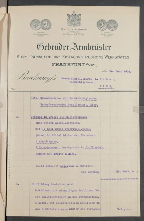 V176 Senckenberg Gesellschaft für Naturforschung, 520 - Ankauf von Museumsschränken bei der Firma Gebrüder Armbrüster