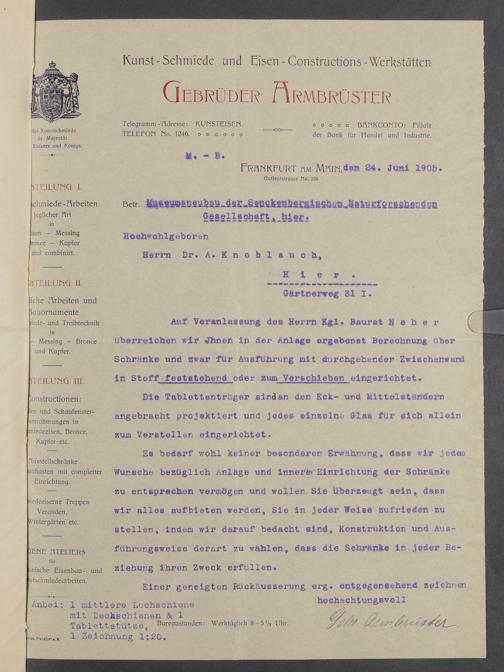 V176 Senckenberg Gesellschaft für Naturforschung, 520 - Ankauf von Museumsschränken bei der Firma Gebrüder Armbrüster