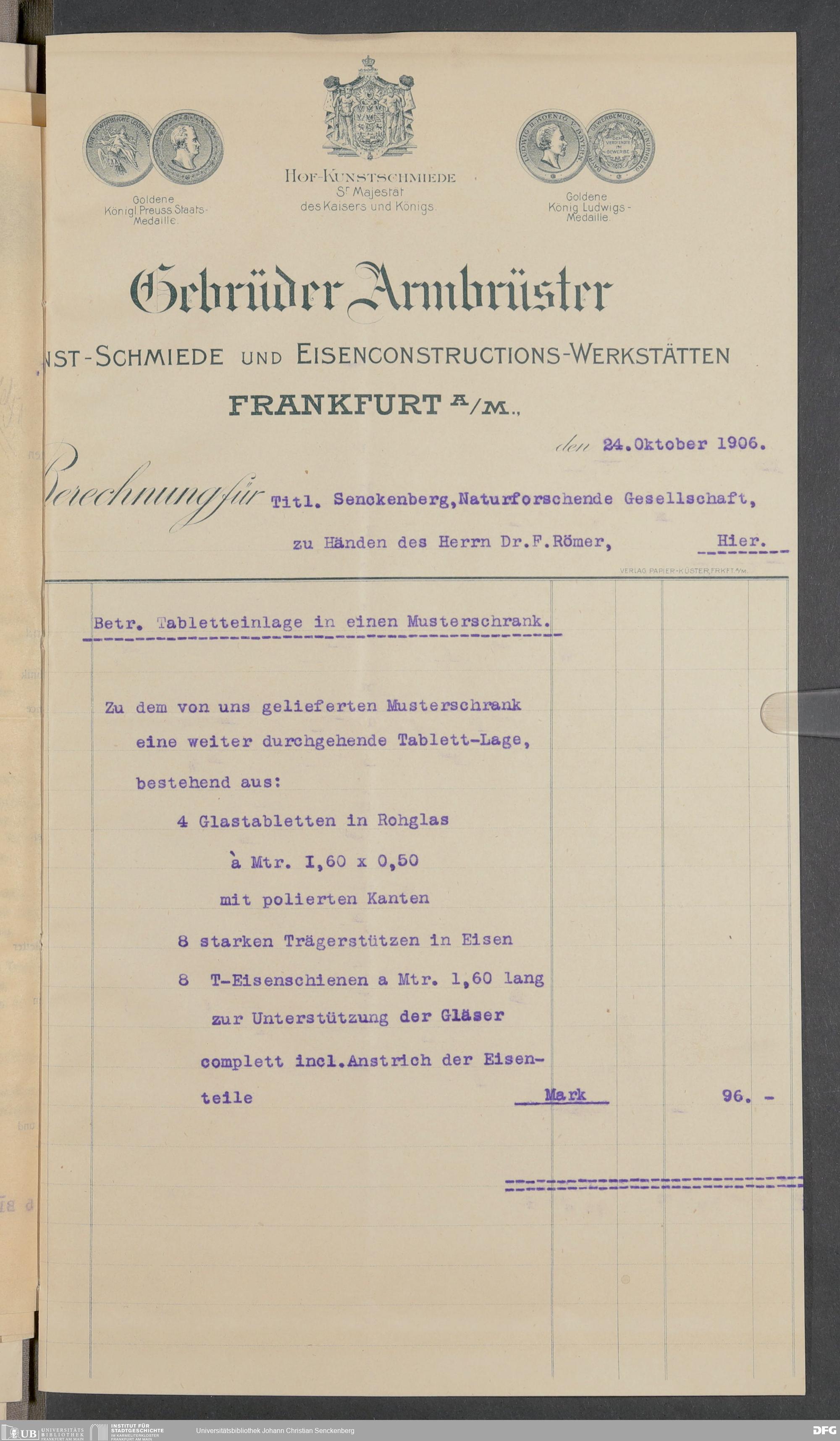 V176 Senckenberg Gesellschaft für Naturforschung, 520 - Ankauf von Museumsschränken bei der Firma Gebrüder Armbrüster