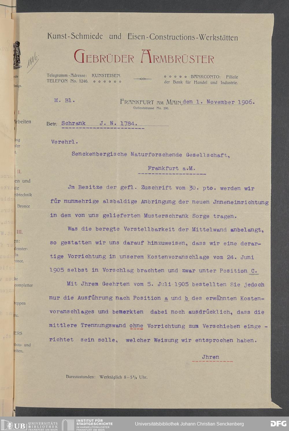 V176 Senckenberg Gesellschaft für Naturforschung, 520 - Ankauf von Museumsschränken bei der Firma Gebrüder Armbrüster