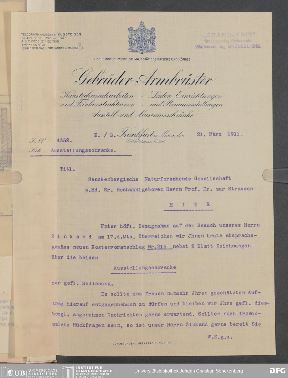 V176 Senckenberg Gesellschaft für Naturforschung, 520 - Ankauf von Museumsschränken bei der Firma Gebrüder Armbrüster