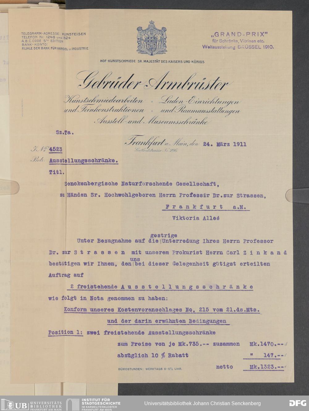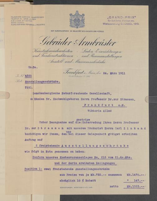 V176 Senckenberg Gesellschaft für Naturforschung, 520 - Ankauf von Museumsschränken bei der Firma Gebrüder Armbrüster