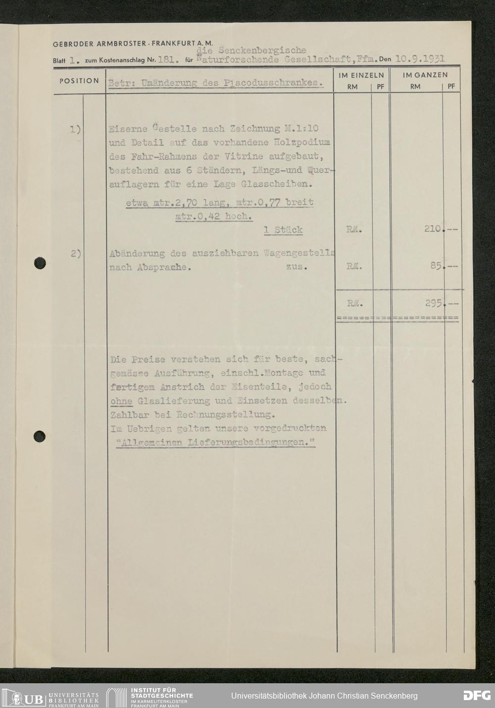 V176 Senckenberg Gesellschaft für Naturforschung, 520 - Ankauf von Museumsschränken bei der Firma Gebrüder Armbrüster