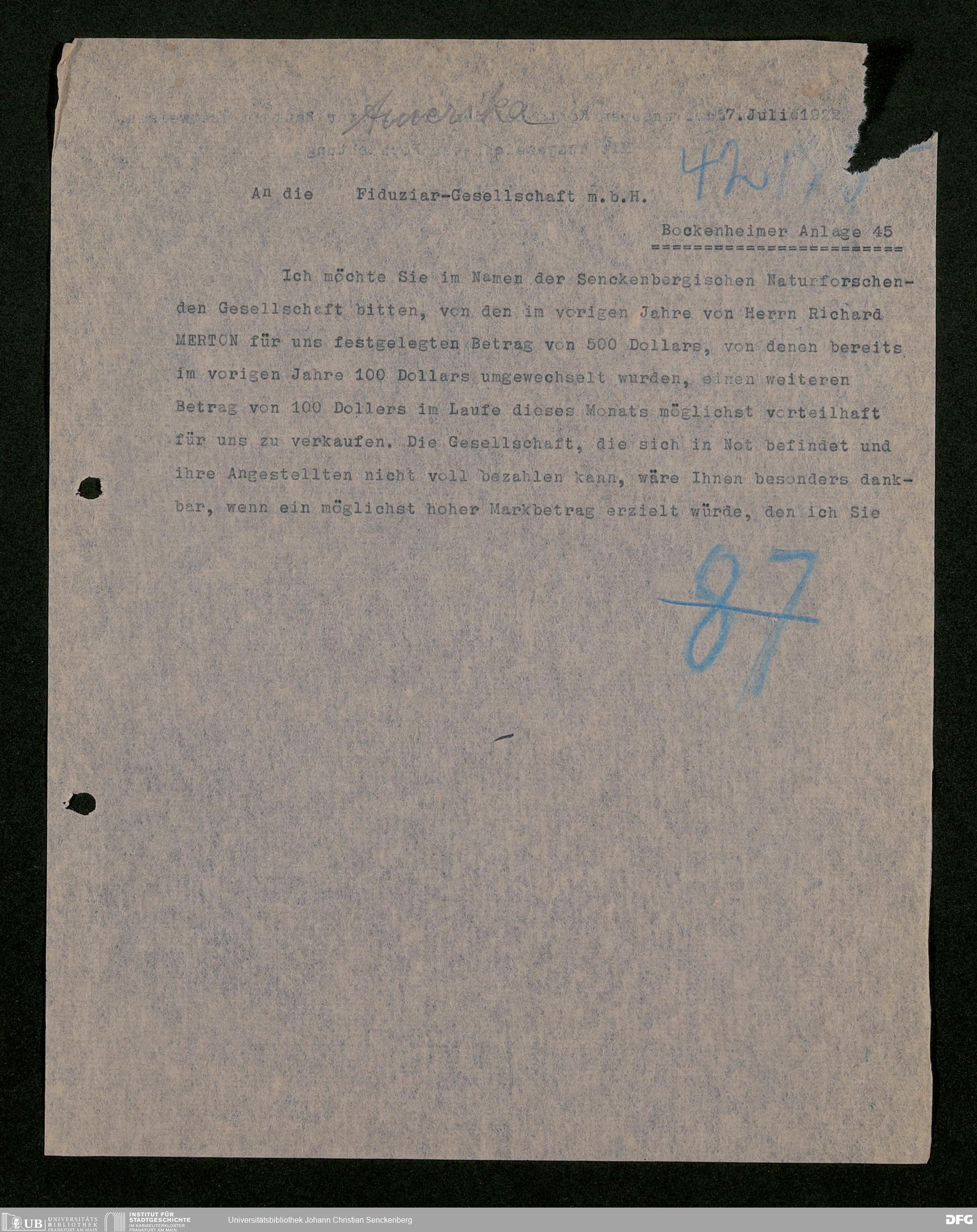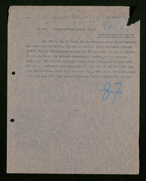 V176 Senckenberg Gesellschaft für Naturforschung, 528 - Mitgliederwerbung in und Bitten um finanzielle Unterstützung aus den USA