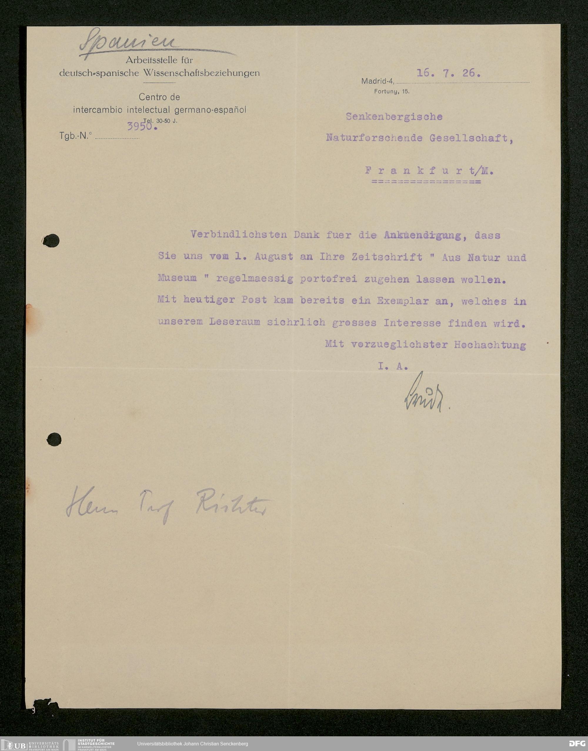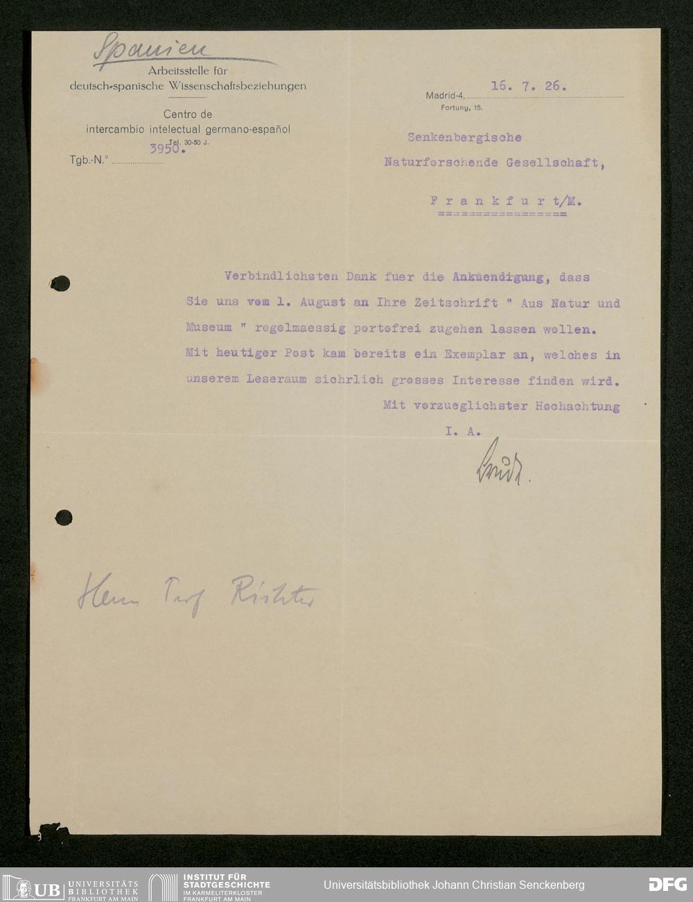 V176 Senckenberg Gesellschaft für Naturforschung, 535 - Mitgliederwerbung in und Geldspenden aus Spanien