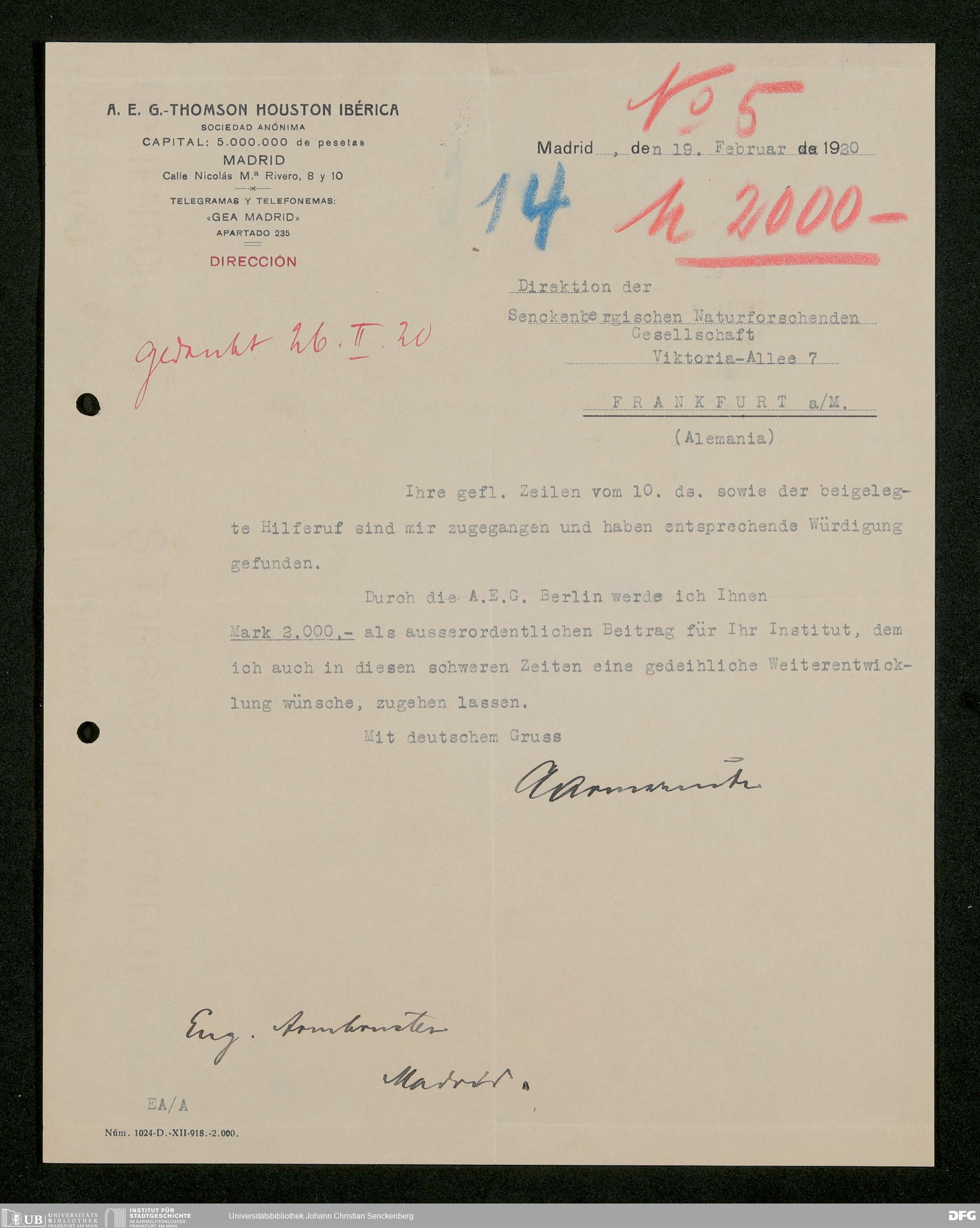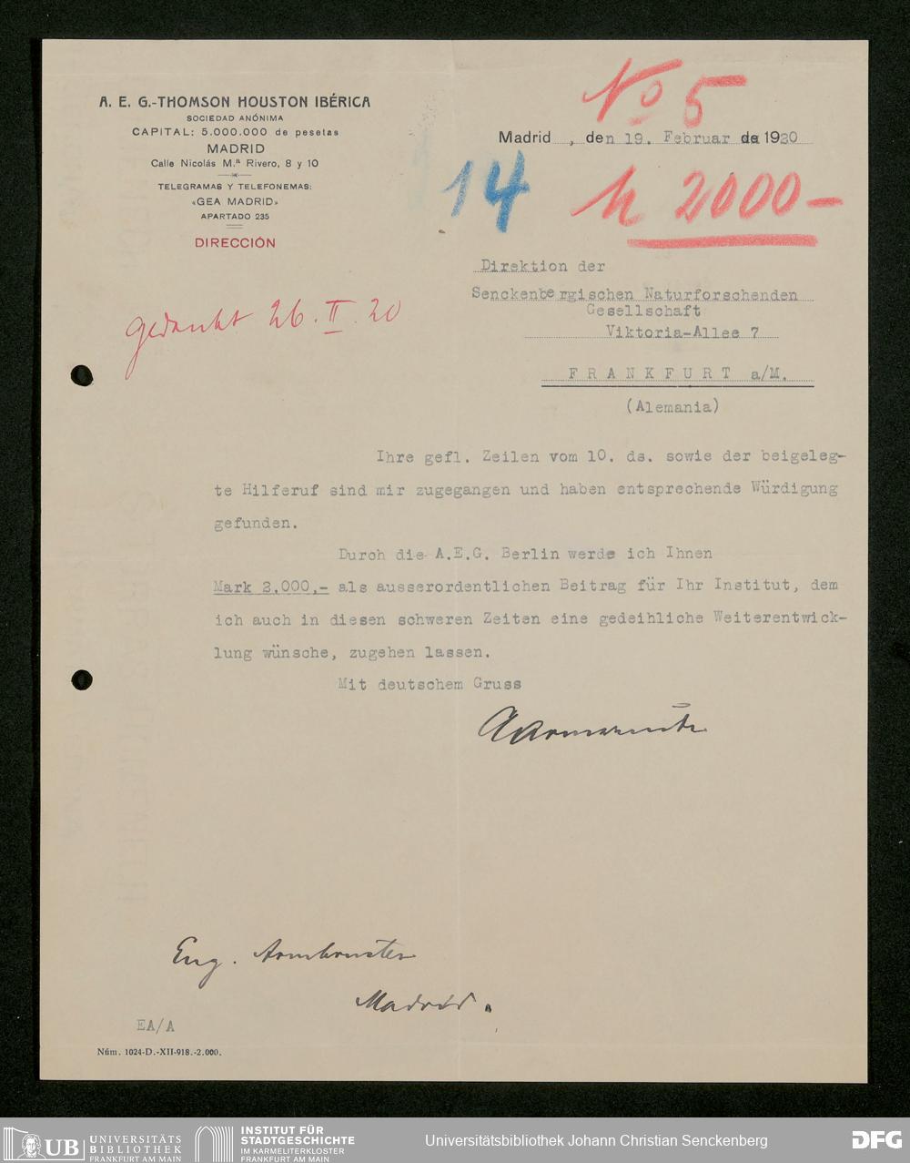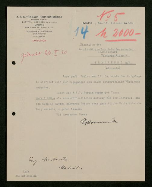 V176 Senckenberg Gesellschaft für Naturforschung, 535 - Mitgliederwerbung in und Geldspenden aus Spanien