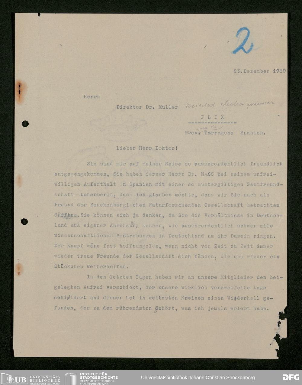 V176 Senckenberg Gesellschaft für Naturforschung, 535 - Mitgliederwerbung in und Geldspenden aus Spanien
