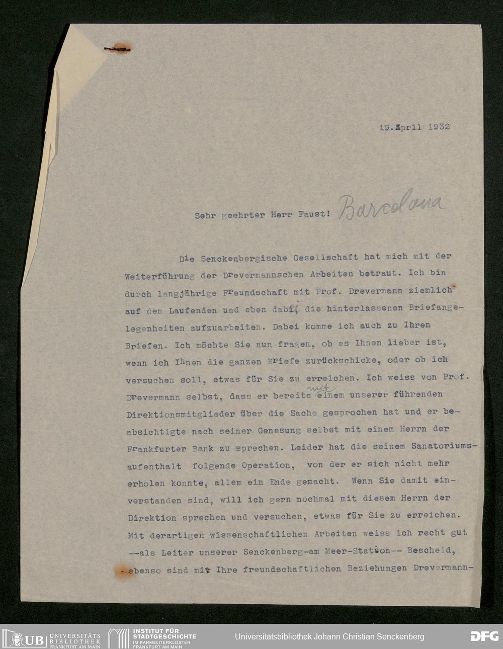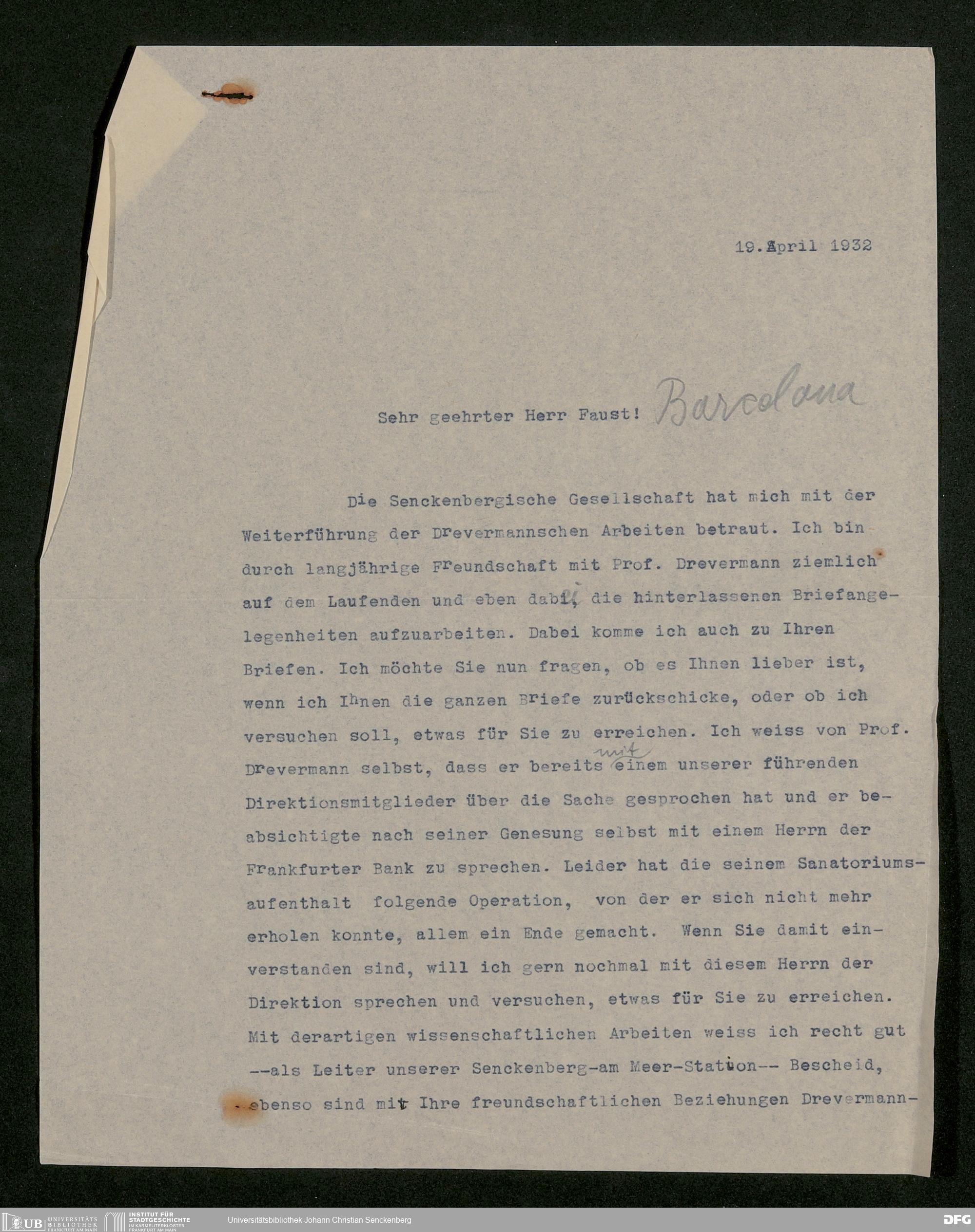 V176 Senckenberg Gesellschaft für Naturforschung, 536 - Bitte um Unterstützung in einer Hypothekenangelegenheit von Karl Faust an Fritz Drevermann