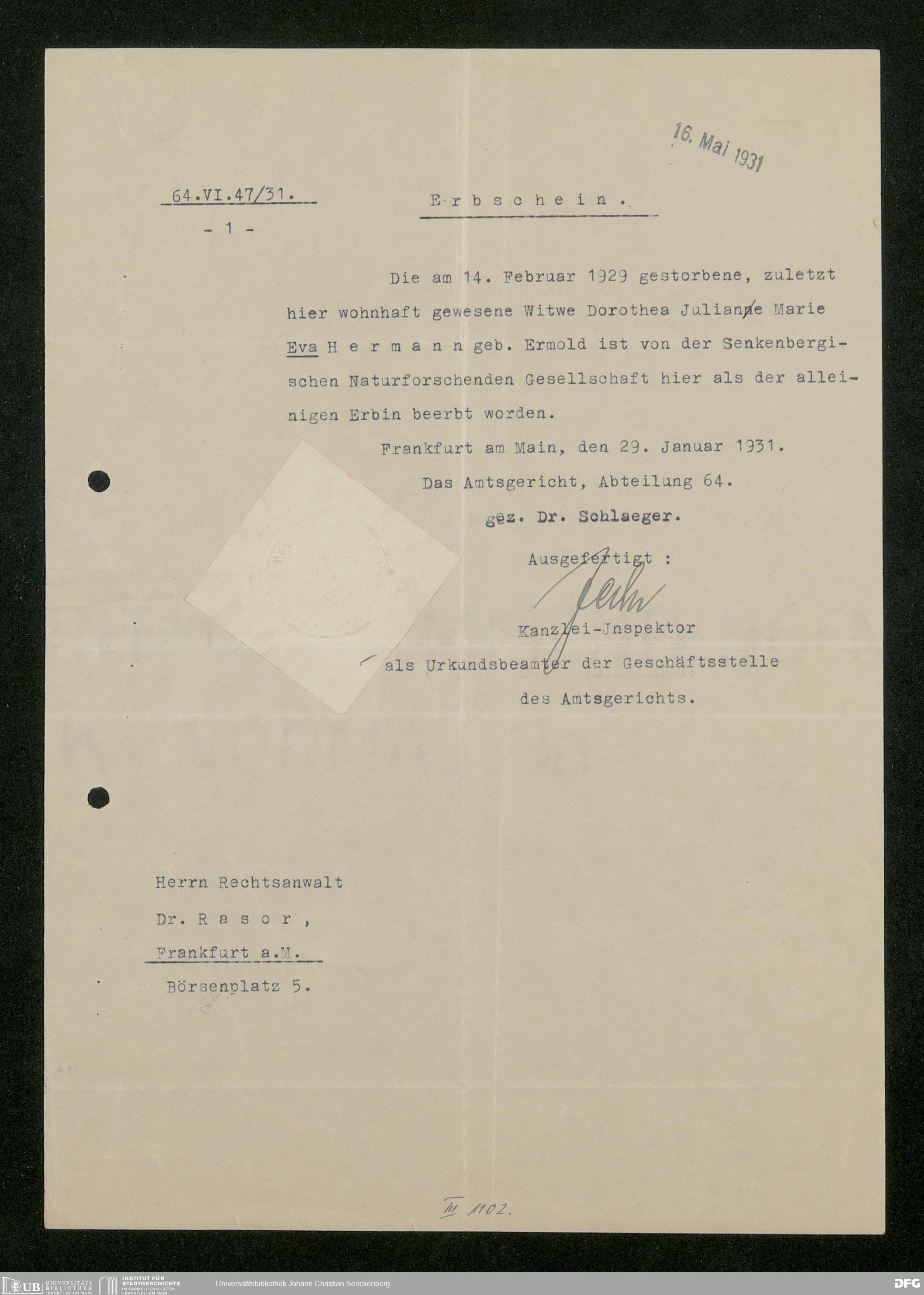 V176 Senckenberg Gesellschaft für Naturforschung, 543 - Verwaltung des Nachlasses von Eva Hermann geb. Ermold