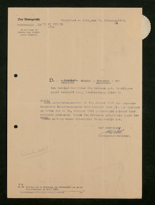 V176 Senckenberg Gesellschaft für Naturforschung, 543 - Verwaltung des Nachlasses von Eva Hermann geb. Ermold
