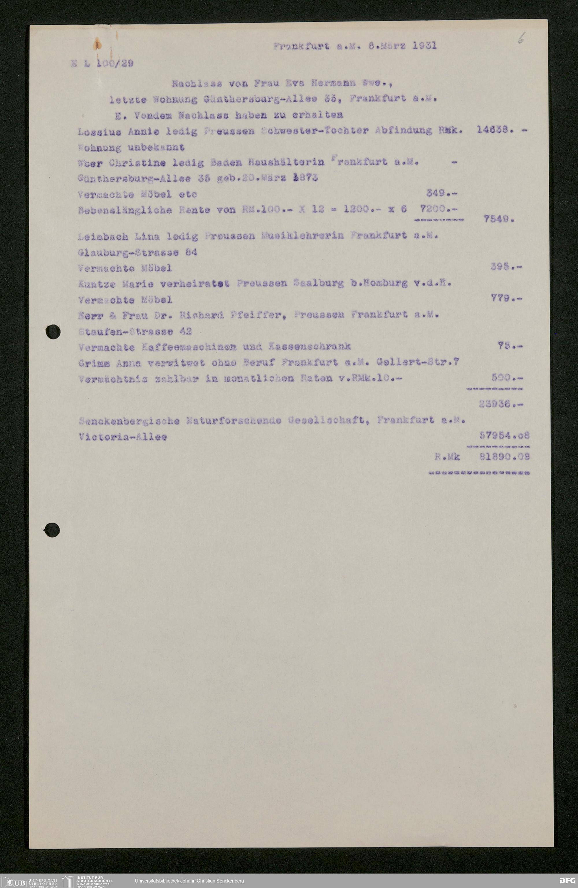 V176 Senckenberg Gesellschaft für Naturforschung, 543 - Verwaltung des Nachlasses von Eva Hermann geb. Ermold