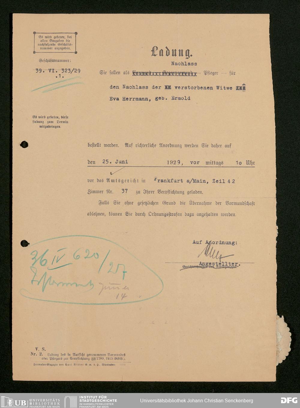 V176 Senckenberg Gesellschaft für Naturforschung, 543 - Verwaltung des Nachlasses von Eva Hermann geb. Ermold
