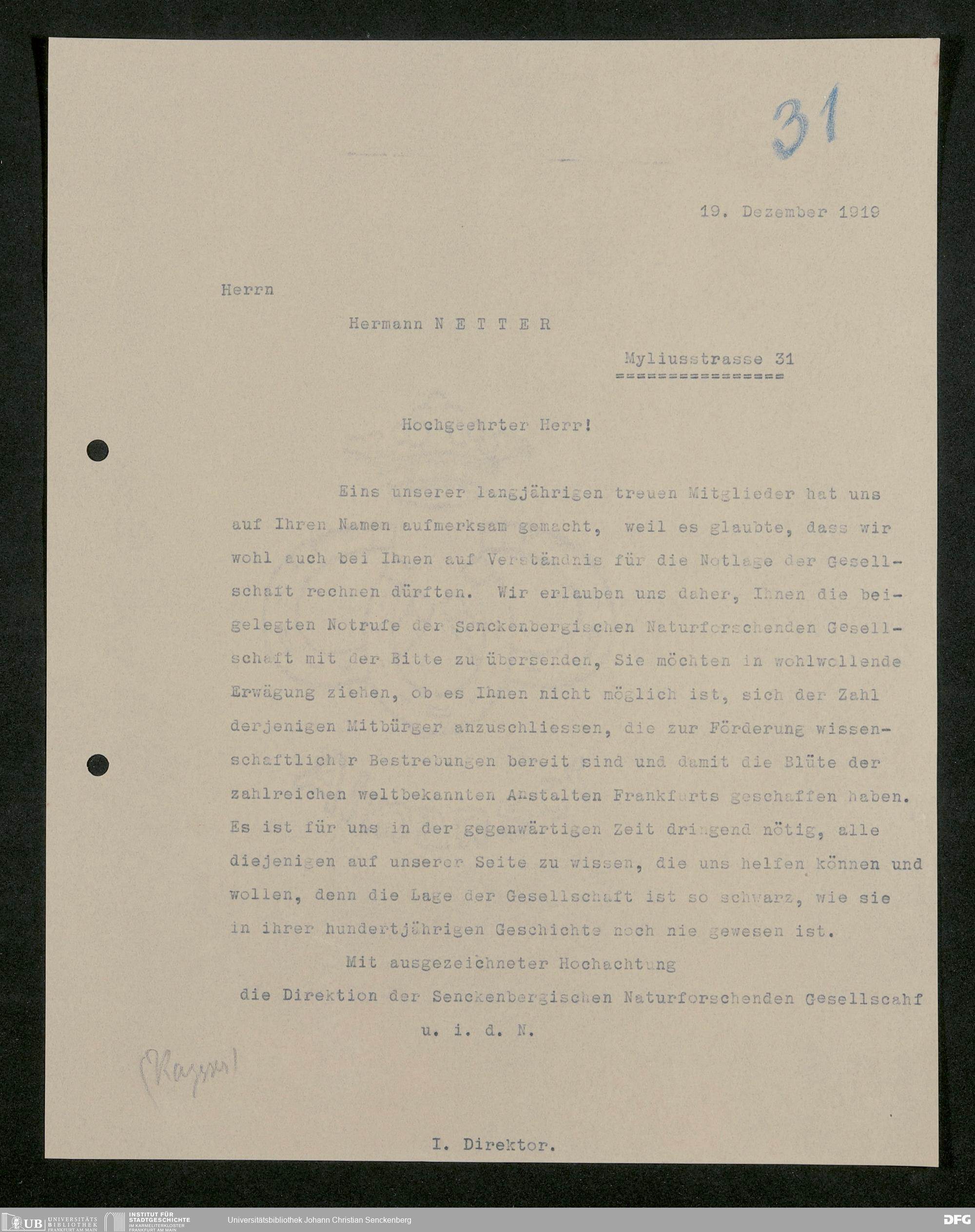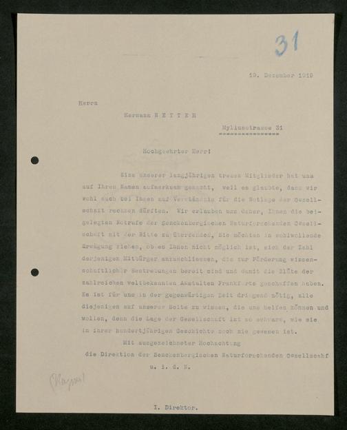 V176 Senckenberg Gesellschaft für Naturforschung, 581 - Mitgliederwerbung und Bitten um finanzielle Unterstützung der Senckenbergischen Naturforschenden Gesellschaft
