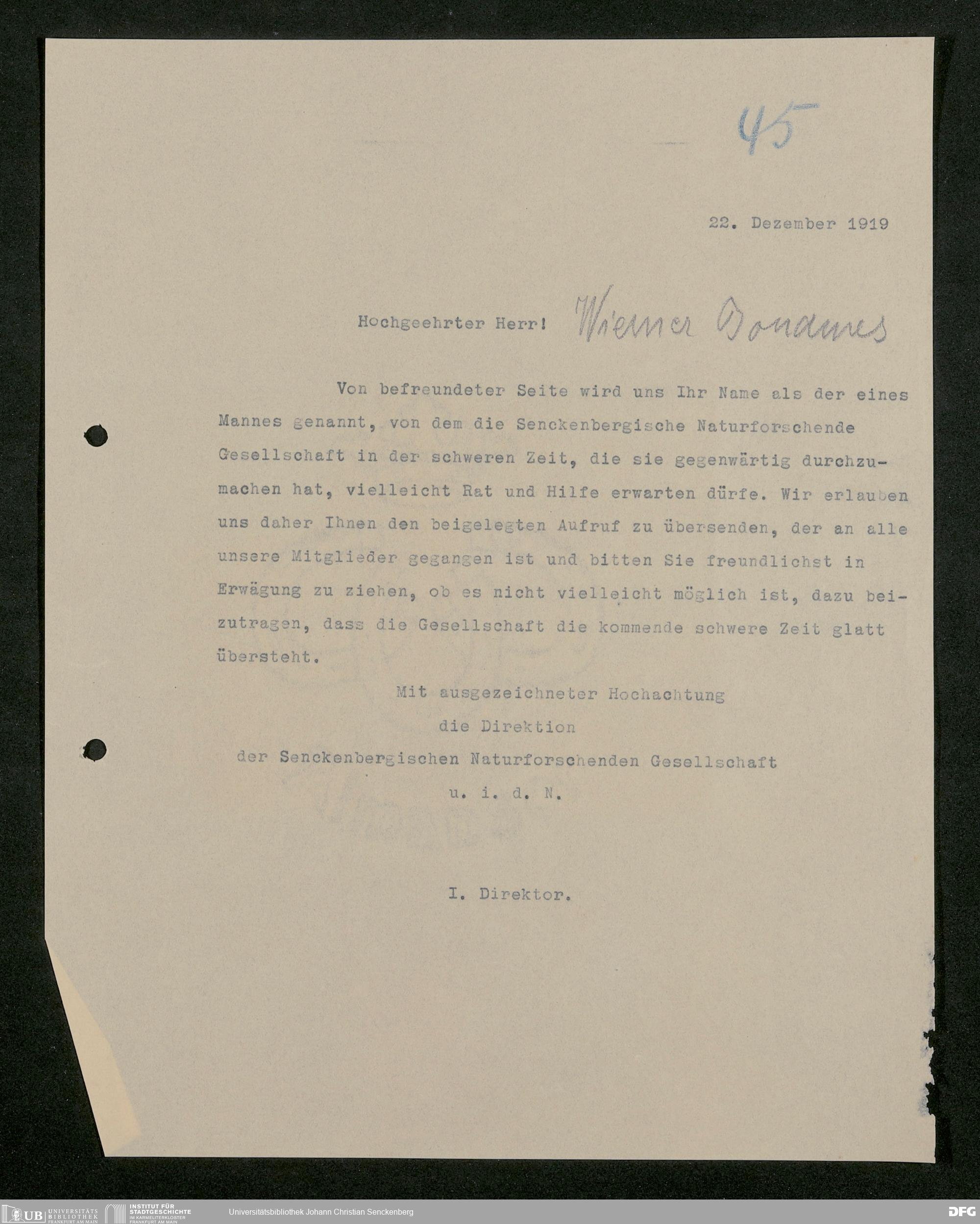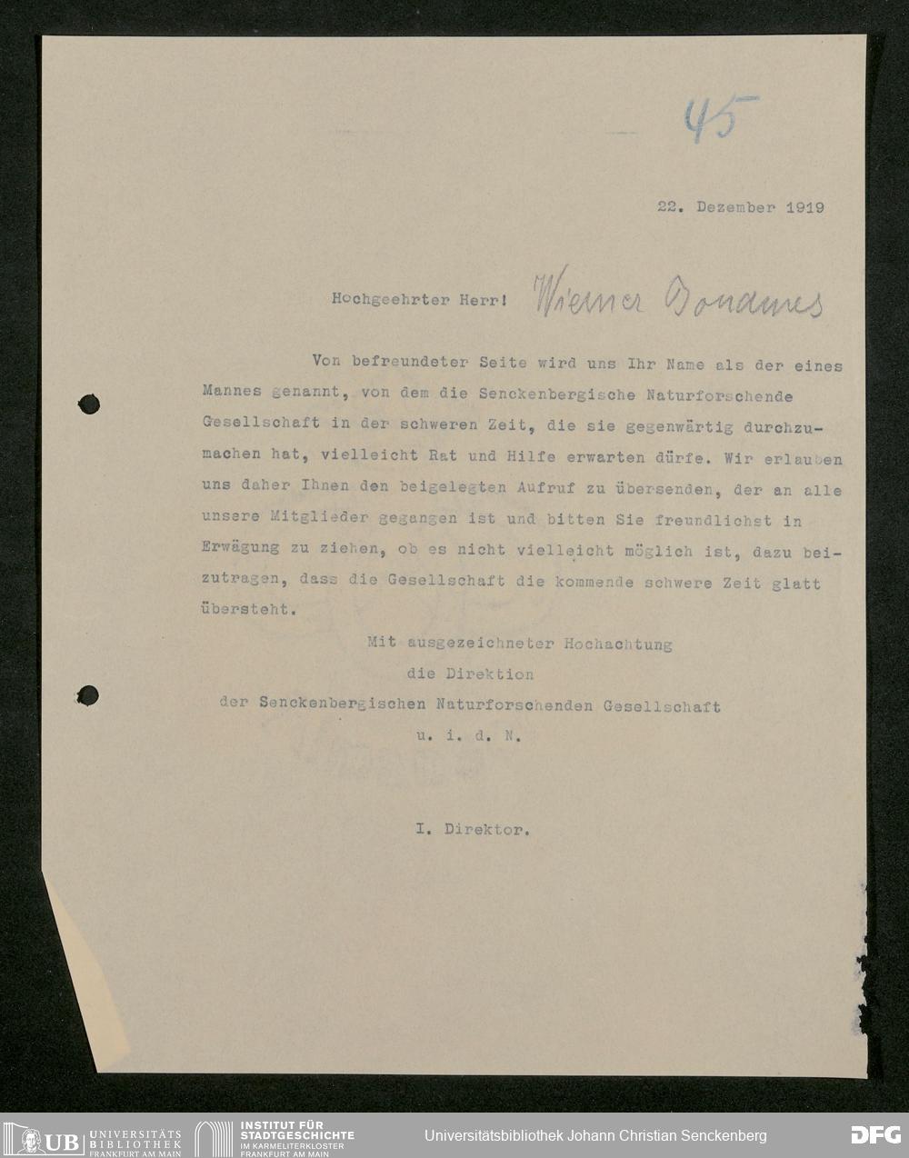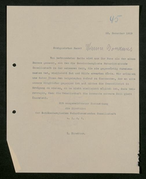 V176 Senckenberg Gesellschaft für Naturforschung, 581 - Mitgliederwerbung und Bitten um finanzielle Unterstützung der Senckenbergischen Naturforschenden Gesellschaft