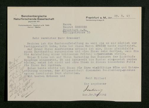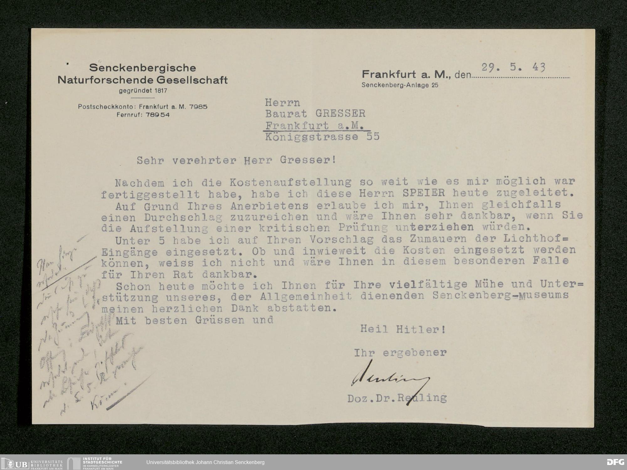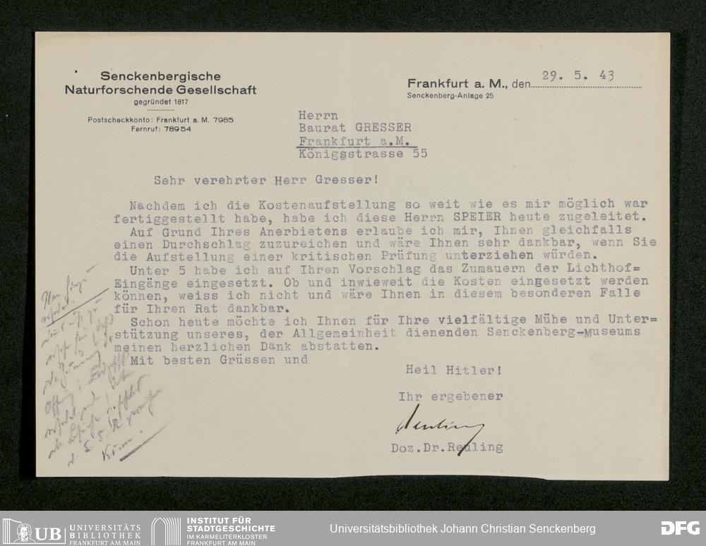 V176 Senckenberg Gesellschaft für Naturforschung, 598 - Kostenaufstellung für den Einbau eines Luftschutzkellers im Senckenbergmuseum mit Stellungnahme von Magistratsbaurat Heinrich Gresser