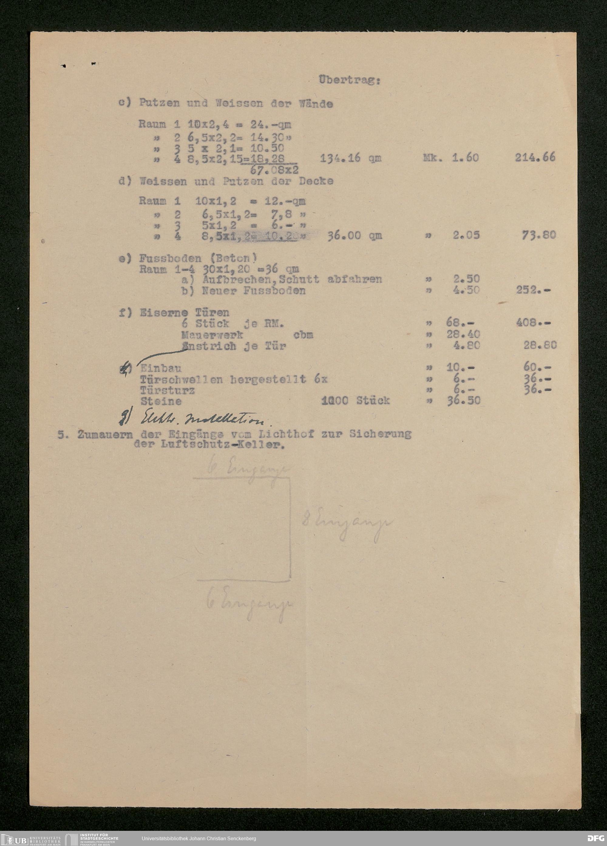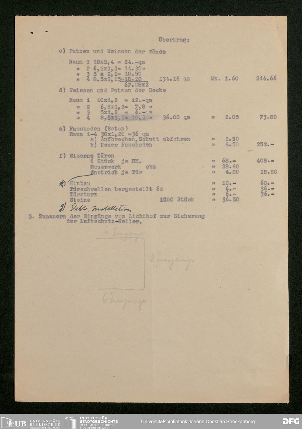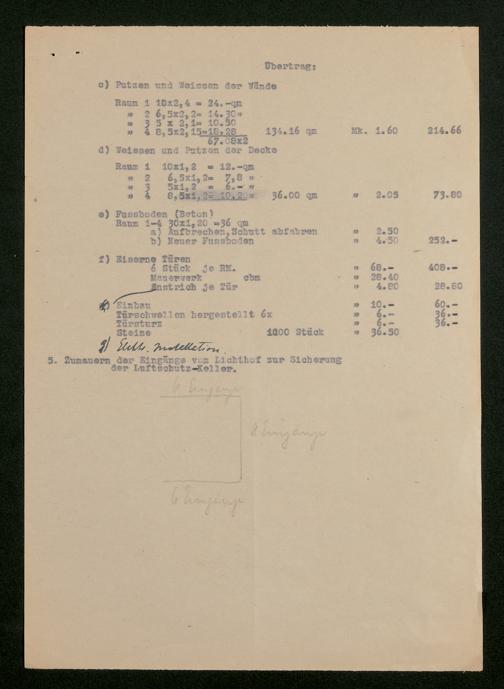 V176 Senckenberg Gesellschaft für Naturforschung, 598 - Kostenaufstellung für den Einbau eines Luftschutzkellers im Senckenbergmuseum mit Stellungnahme von Magistratsbaurat Heinrich Gresser