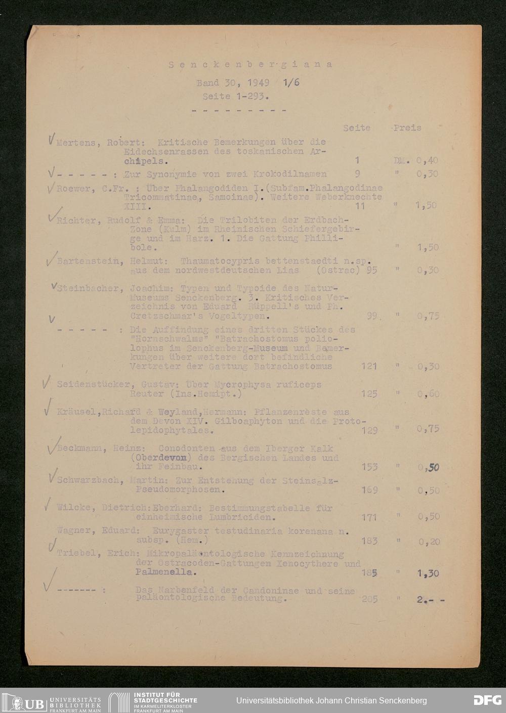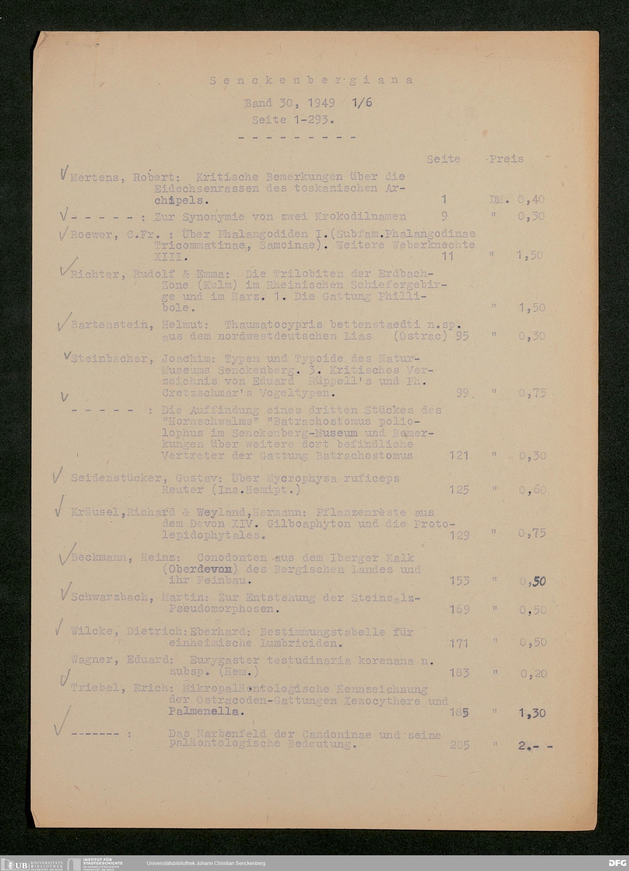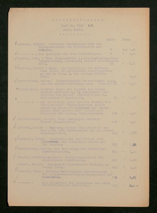 V176 Senckenberg Gesellschaft für Naturforschung, 599 - Preisverzeichnisse für Einzeldrucke aus den "Senckenbergiana"