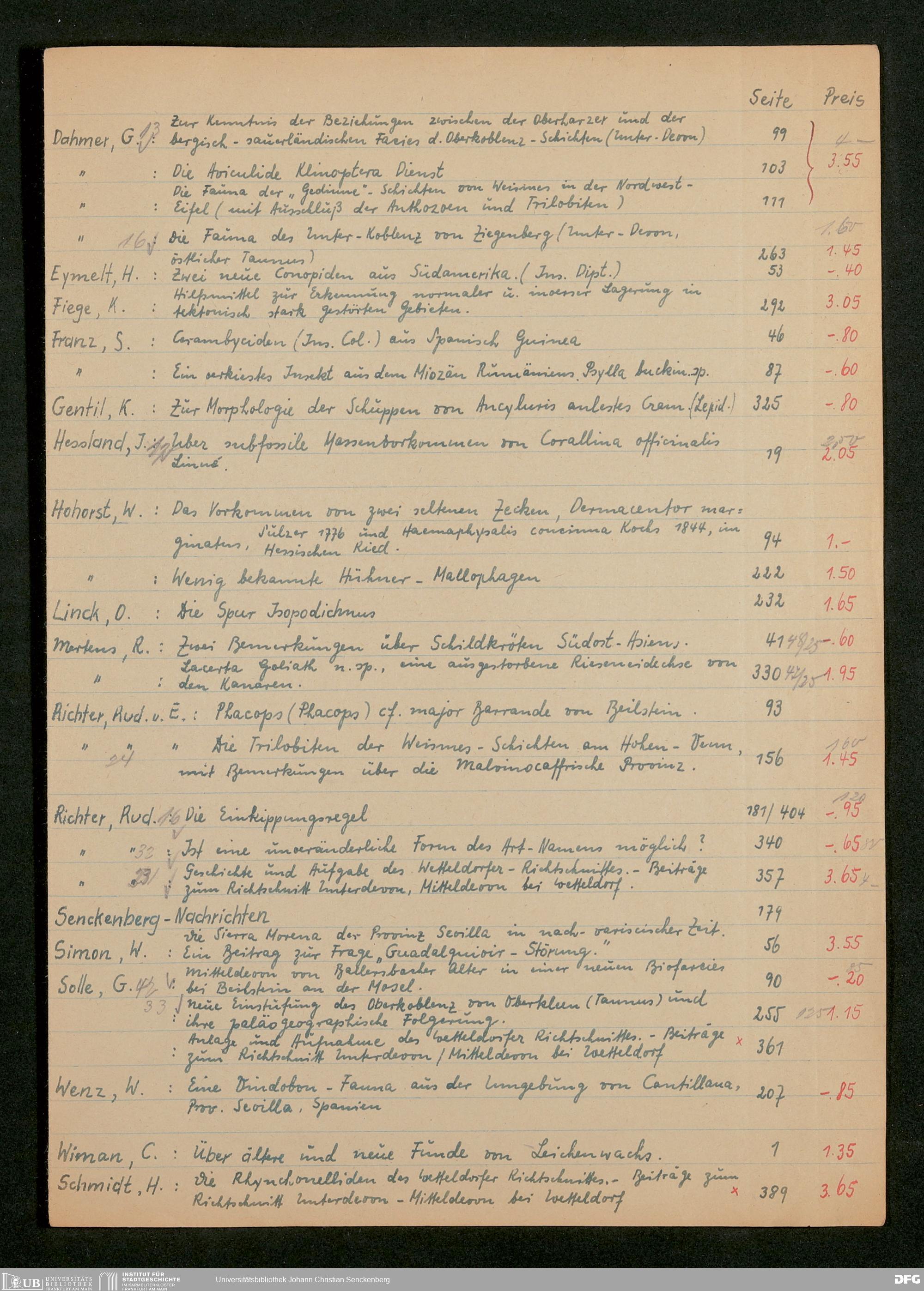 V176 Senckenberg Gesellschaft für Naturforschung, 599 - Preisverzeichnisse für Einzeldrucke aus den "Senckenbergiana"