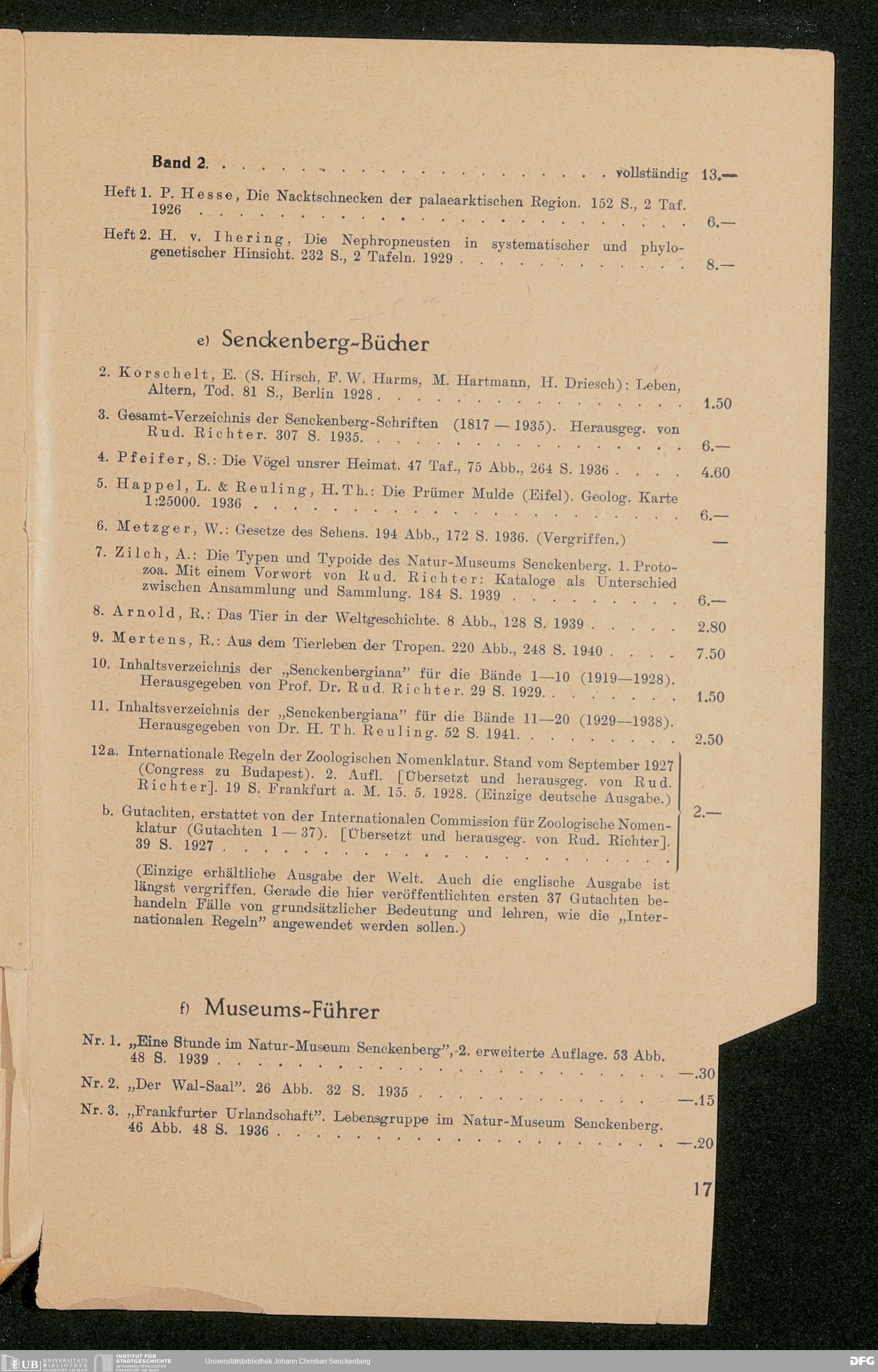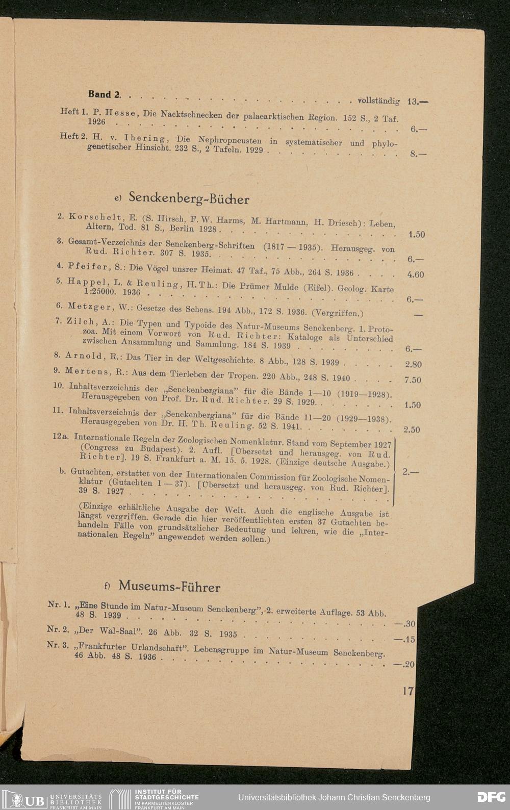 V176 Senckenberg Gesellschaft für Naturforschung, 600 - Preisliste für die Publikationen der Senckenbergischen Naturforschenden Gesellschaft