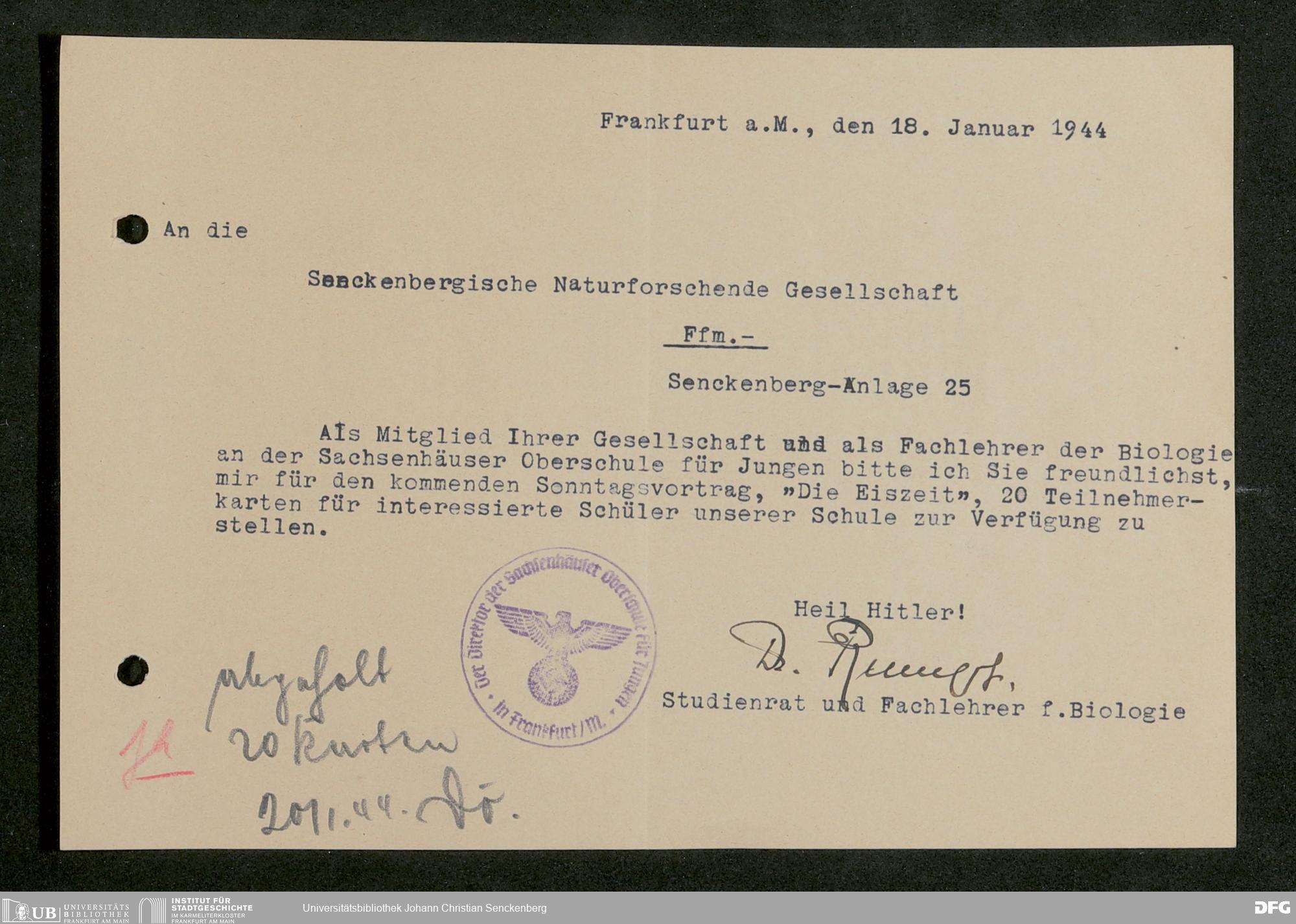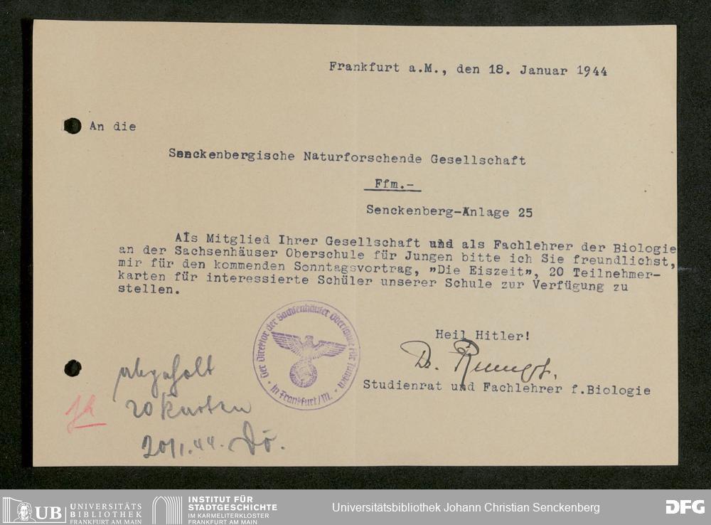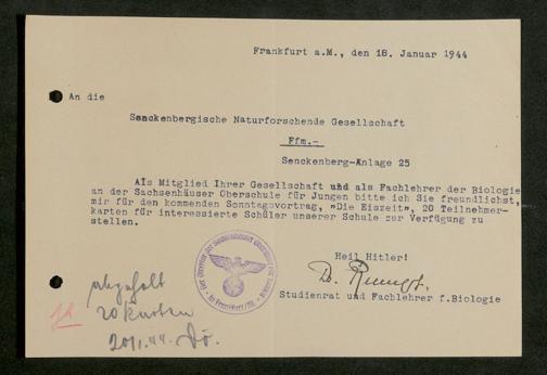 V176 Senckenberg Gesellschaft für Naturforschung, 641 - Vergabe von Freikarten zur Vorlesungen und Vorträgen der Senckenbergischen Naturforschenden Gesellschaft an Firmen, Lazarette und Schulen