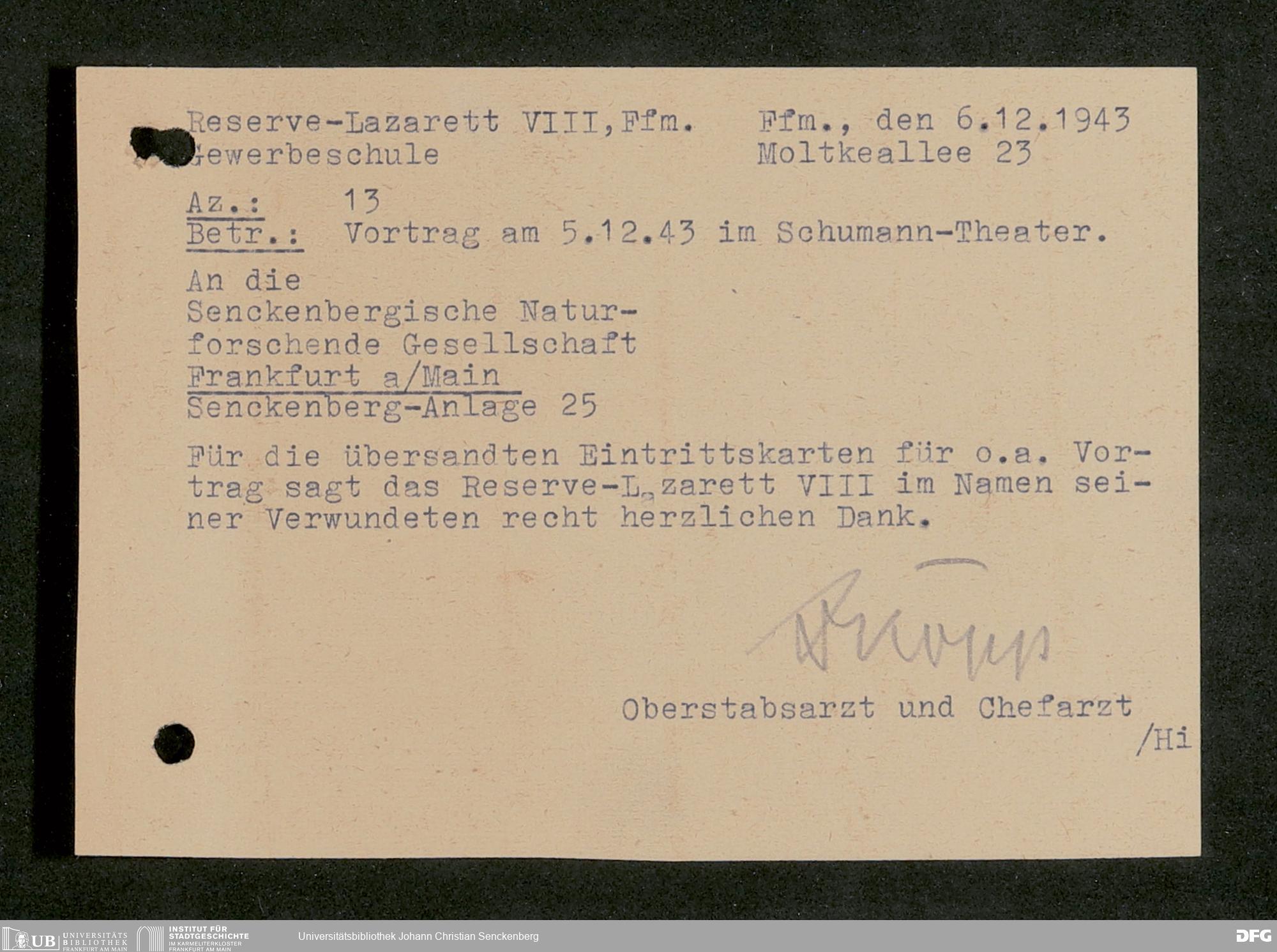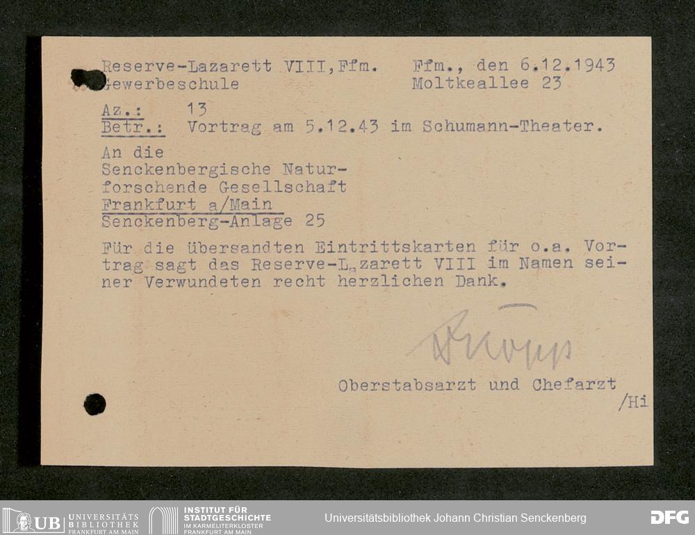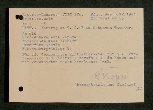 V176 Senckenberg Gesellschaft für Naturforschung, 641 - Vergabe von Freikarten zur Vorlesungen und Vorträgen der Senckenbergischen Naturforschenden Gesellschaft an Firmen, Lazarette und Schulen