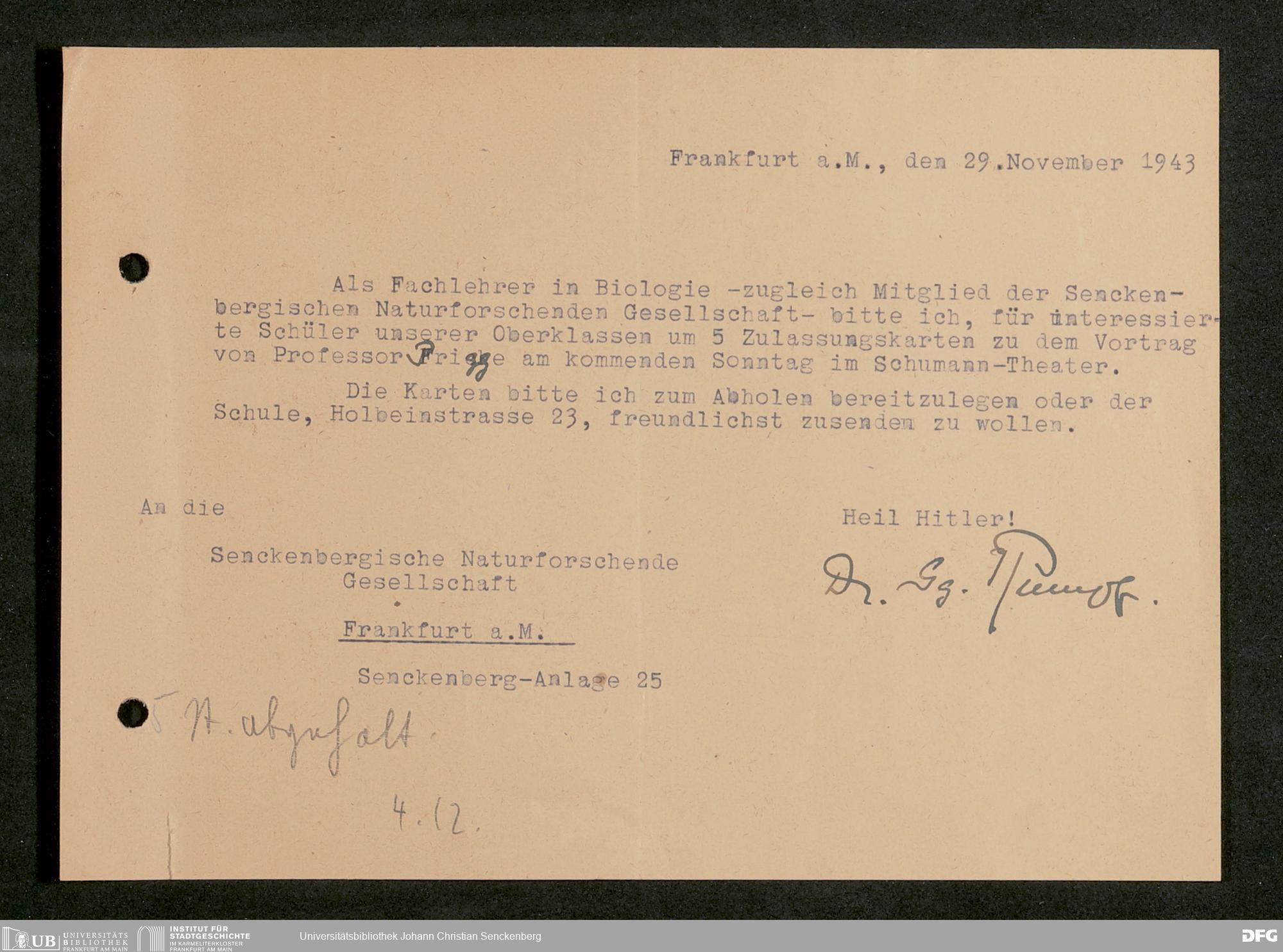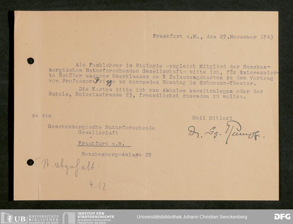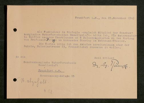 V176 Senckenberg Gesellschaft für Naturforschung, 641 - Vergabe von Freikarten zur Vorlesungen und Vorträgen der Senckenbergischen Naturforschenden Gesellschaft an Firmen, Lazarette und Schulen