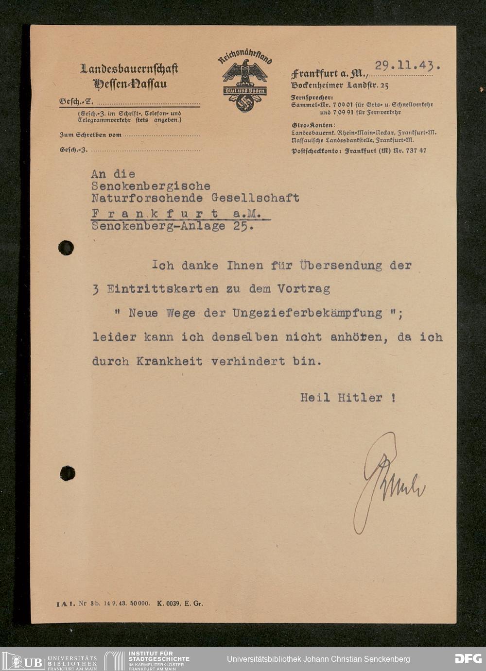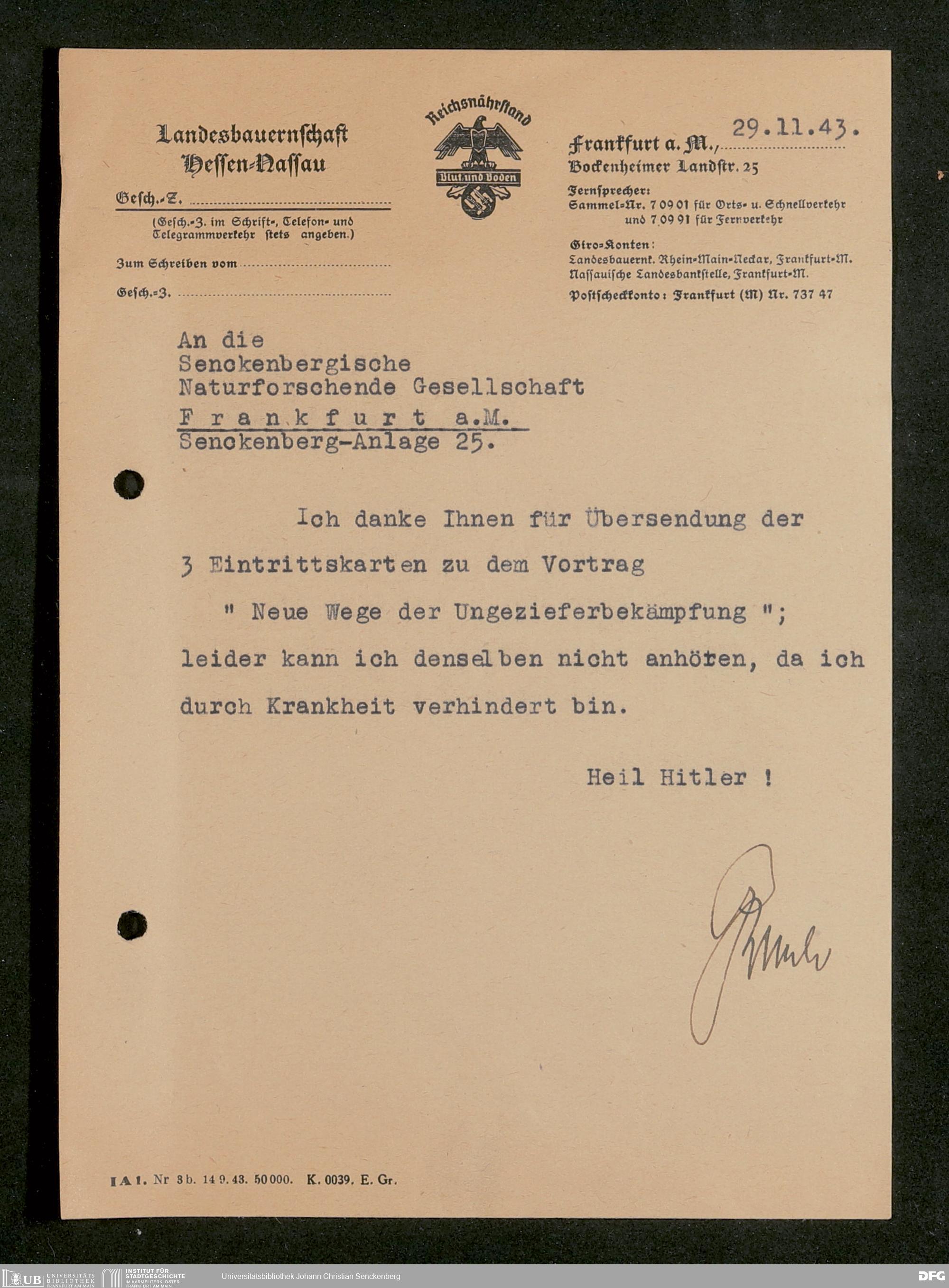 V176 Senckenberg Gesellschaft für Naturforschung, 641 - Vergabe von Freikarten zur Vorlesungen und Vorträgen der Senckenbergischen Naturforschenden Gesellschaft an Firmen, Lazarette und Schulen