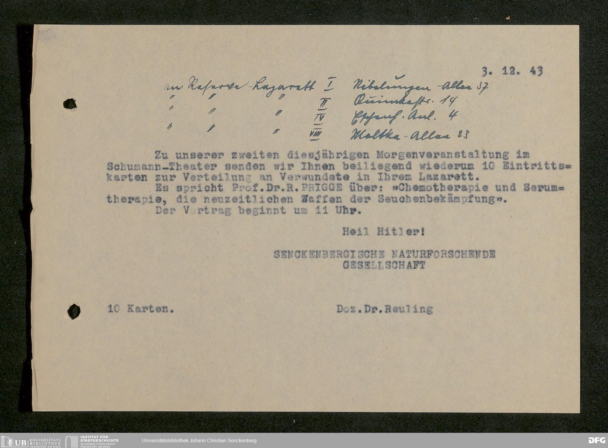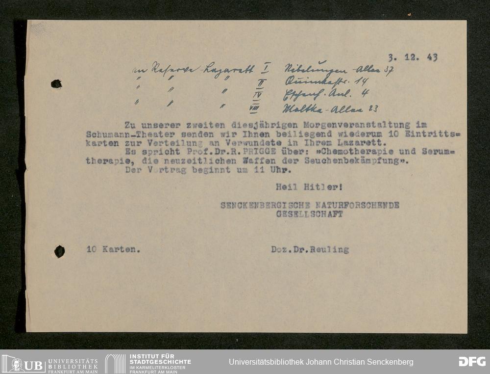 V176 Senckenberg Gesellschaft für Naturforschung, 641 - Vergabe von Freikarten zur Vorlesungen und Vorträgen der Senckenbergischen Naturforschenden Gesellschaft an Firmen, Lazarette und Schulen