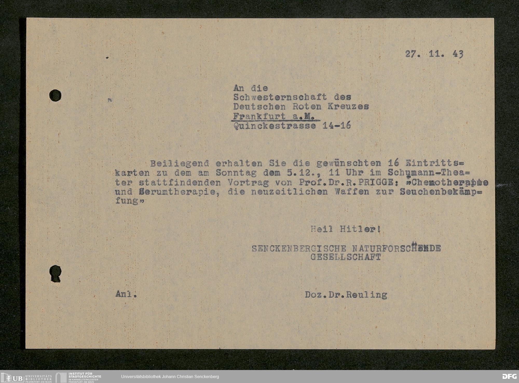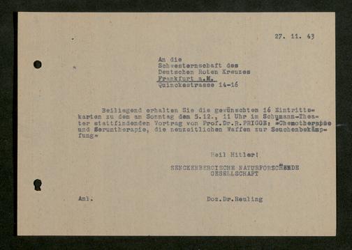 V176 Senckenberg Gesellschaft für Naturforschung, 641 - Vergabe von Freikarten zur Vorlesungen und Vorträgen der Senckenbergischen Naturforschenden Gesellschaft an Firmen, Lazarette und Schulen