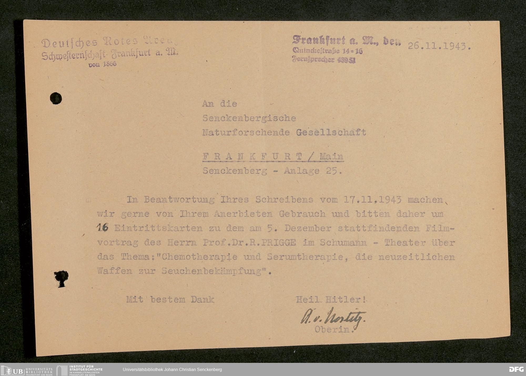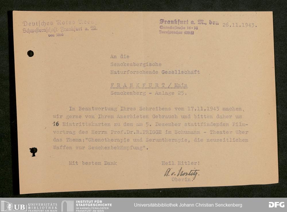 V176 Senckenberg Gesellschaft für Naturforschung, 641 - Vergabe von Freikarten zur Vorlesungen und Vorträgen der Senckenbergischen Naturforschenden Gesellschaft an Firmen, Lazarette und Schulen
