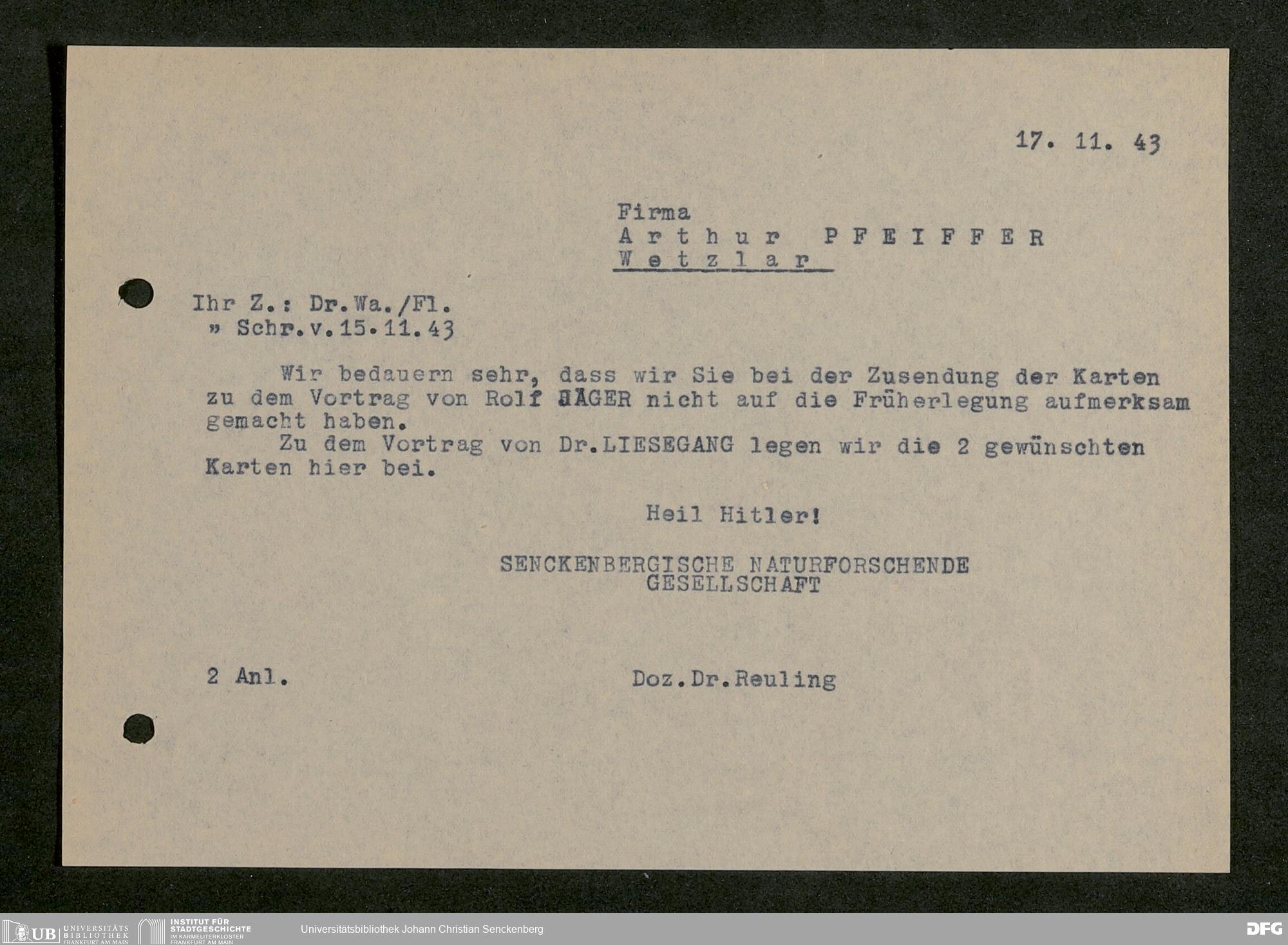 V176 Senckenberg Gesellschaft für Naturforschung, 641 - Vergabe von Freikarten zur Vorlesungen und Vorträgen der Senckenbergischen Naturforschenden Gesellschaft an Firmen, Lazarette und Schulen