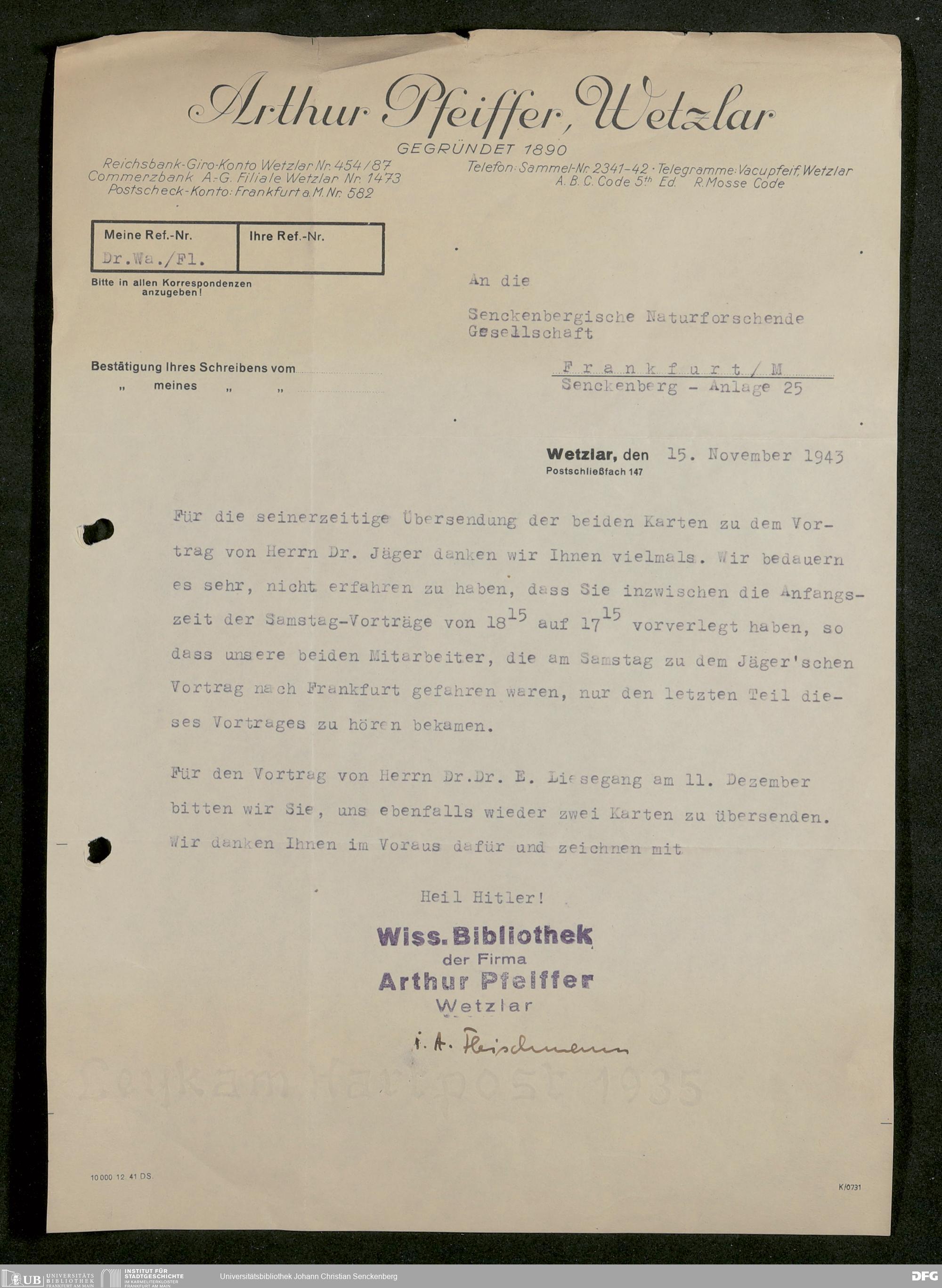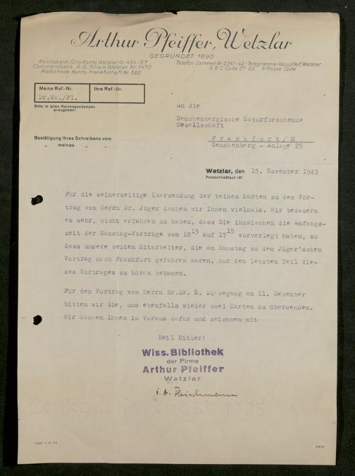 V176 Senckenberg Gesellschaft für Naturforschung, 641 - Vergabe von Freikarten zur Vorlesungen und Vorträgen der Senckenbergischen Naturforschenden Gesellschaft an Firmen, Lazarette und Schulen