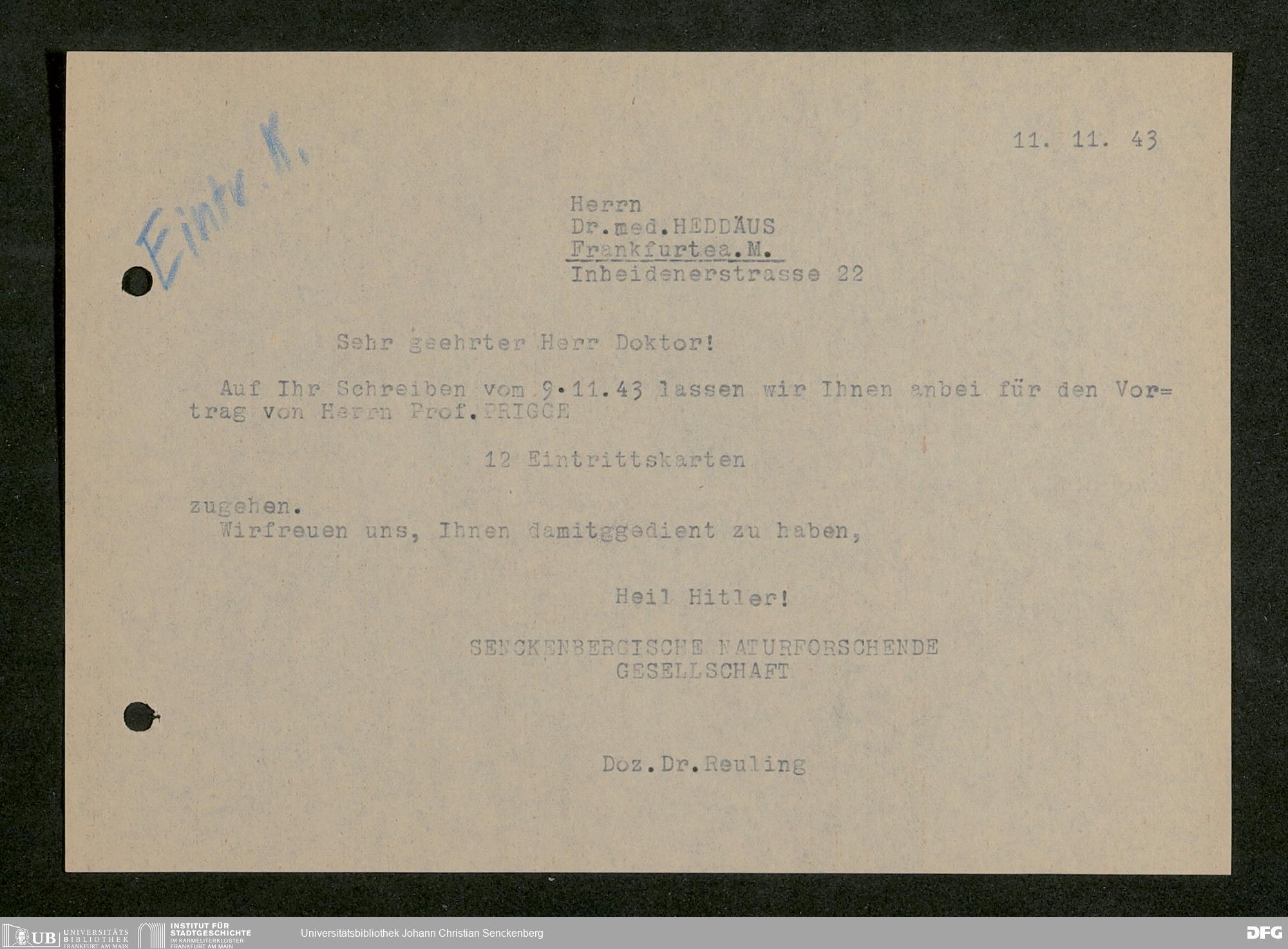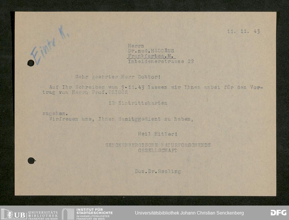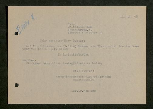 V176 Senckenberg Gesellschaft für Naturforschung, 641 - Vergabe von Freikarten zur Vorlesungen und Vorträgen der Senckenbergischen Naturforschenden Gesellschaft an Firmen, Lazarette und Schulen