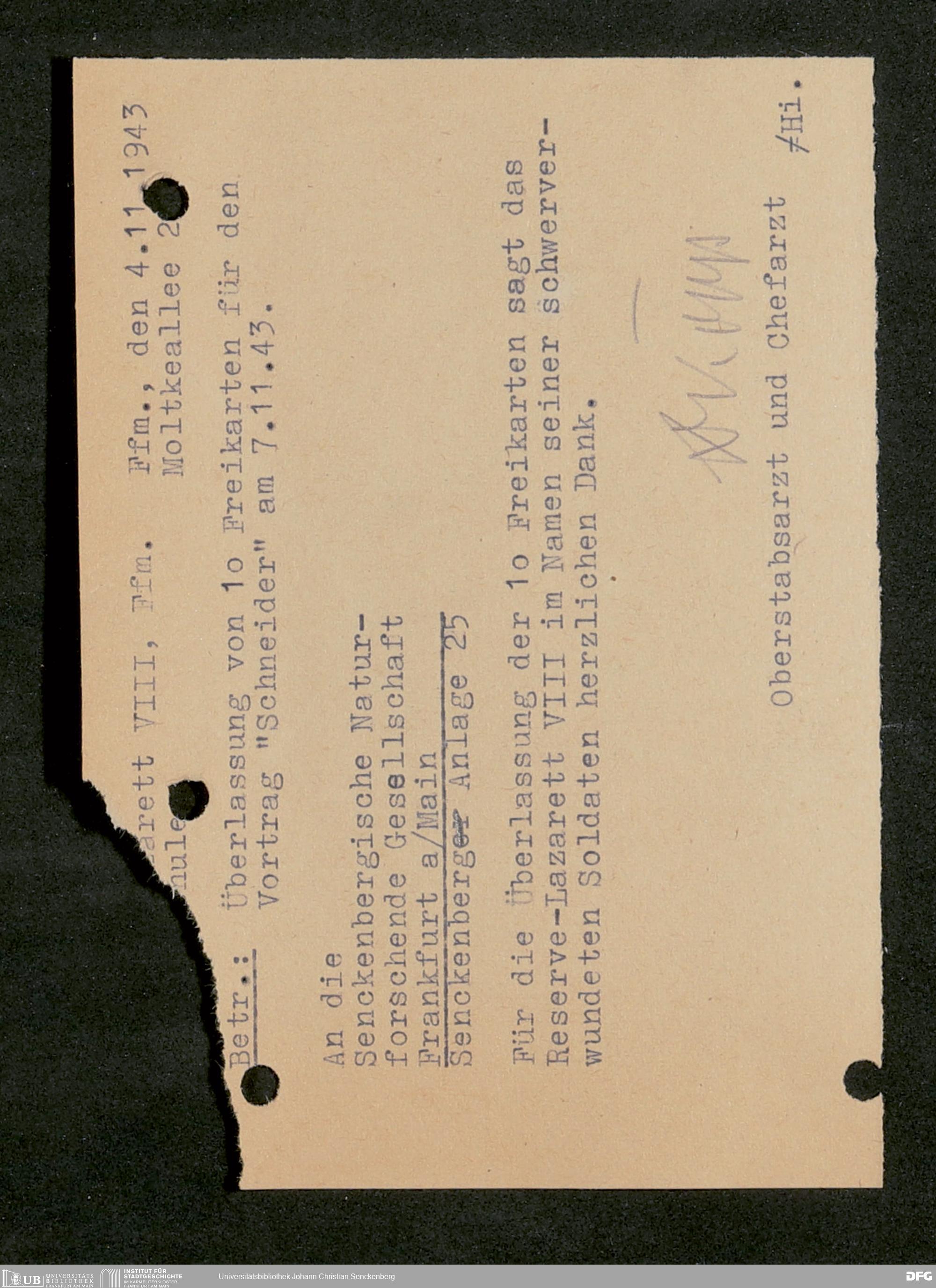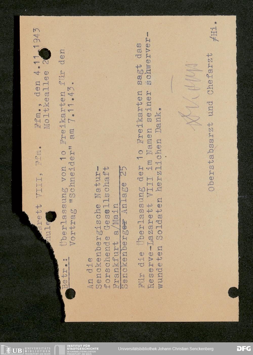 V176 Senckenberg Gesellschaft für Naturforschung, 641 - Vergabe von Freikarten zur Vorlesungen und Vorträgen der Senckenbergischen Naturforschenden Gesellschaft an Firmen, Lazarette und Schulen