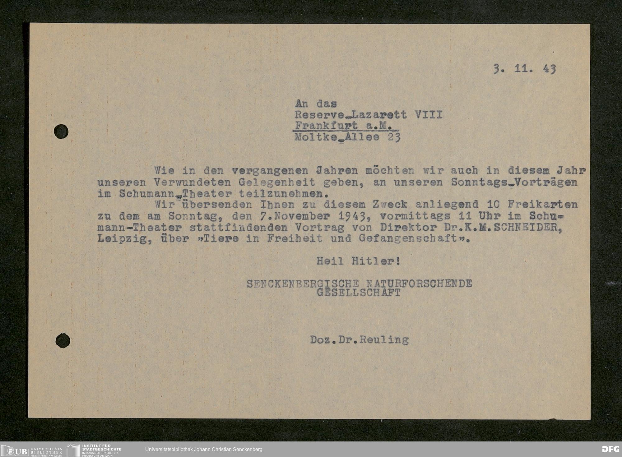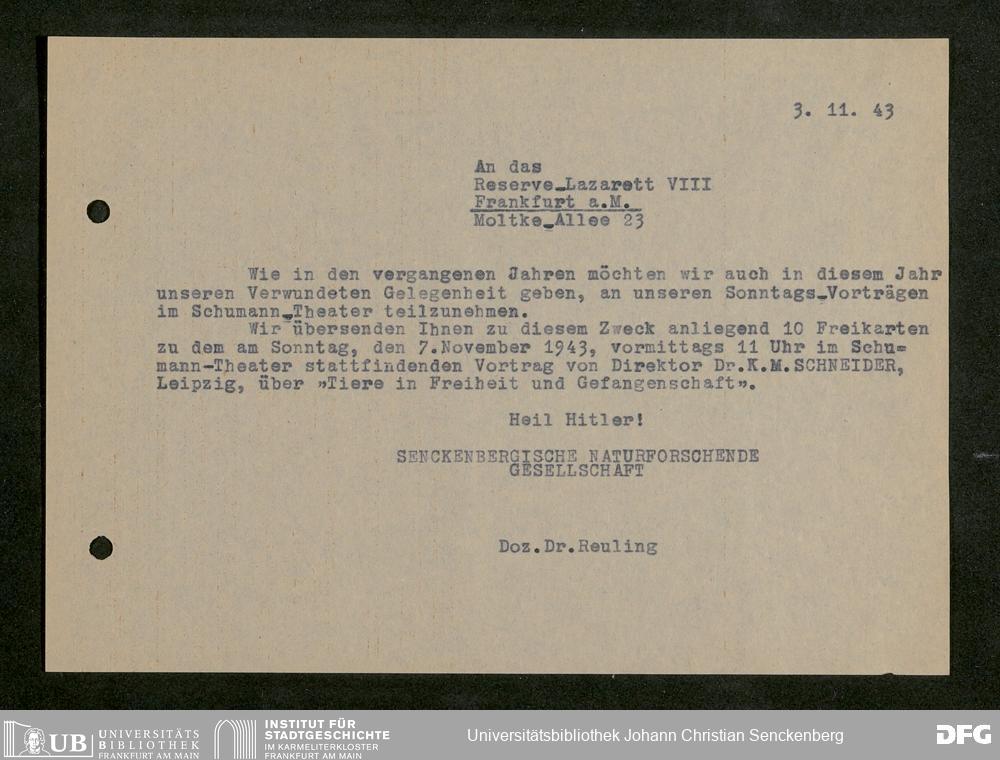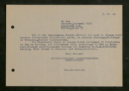 V176 Senckenberg Gesellschaft für Naturforschung, 641 - Vergabe von Freikarten zur Vorlesungen und Vorträgen der Senckenbergischen Naturforschenden Gesellschaft an Firmen, Lazarette und Schulen