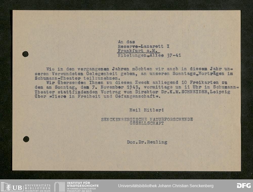 V176 Senckenberg Gesellschaft für Naturforschung, 641 - Vergabe von Freikarten zur Vorlesungen und Vorträgen der Senckenbergischen Naturforschenden Gesellschaft an Firmen, Lazarette und Schulen