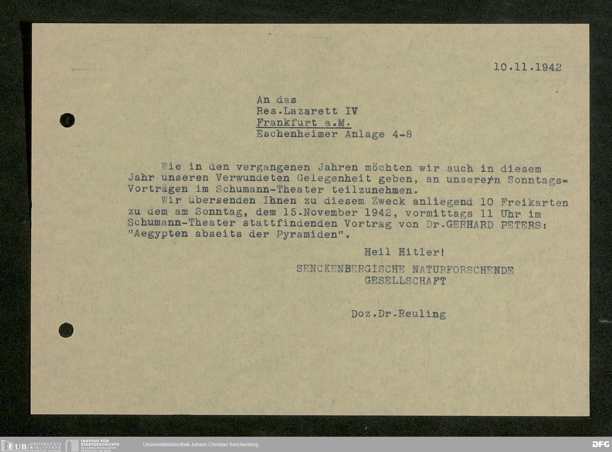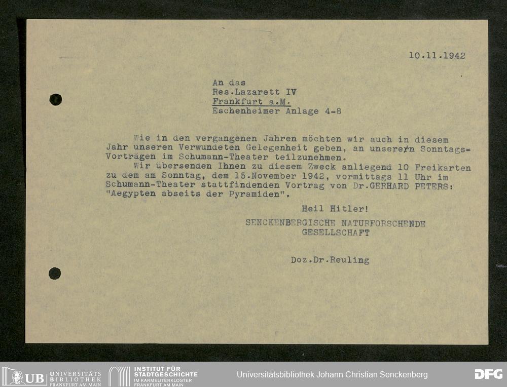 V176 Senckenberg Gesellschaft für Naturforschung, 641 - Vergabe von Freikarten zur Vorlesungen und Vorträgen der Senckenbergischen Naturforschenden Gesellschaft an Firmen, Lazarette und Schulen