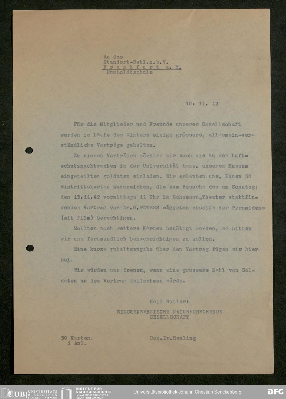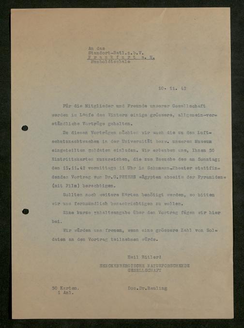 V176 Senckenberg Gesellschaft für Naturforschung, 641 - Vergabe von Freikarten zur Vorlesungen und Vorträgen der Senckenbergischen Naturforschenden Gesellschaft an Firmen, Lazarette und Schulen