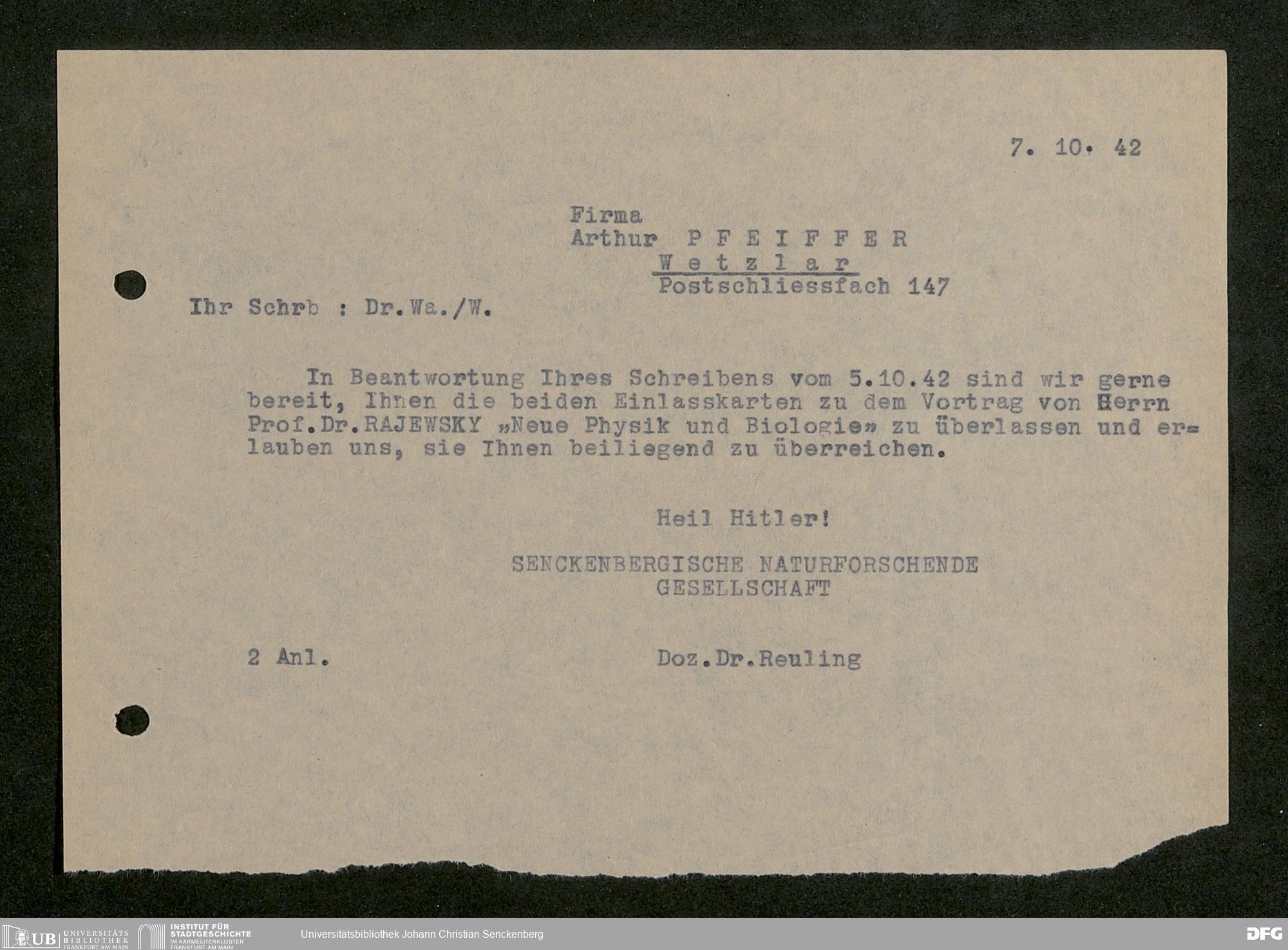 V176 Senckenberg Gesellschaft für Naturforschung, 641 - Vergabe von Freikarten zur Vorlesungen und Vorträgen der Senckenbergischen Naturforschenden Gesellschaft an Firmen, Lazarette und Schulen