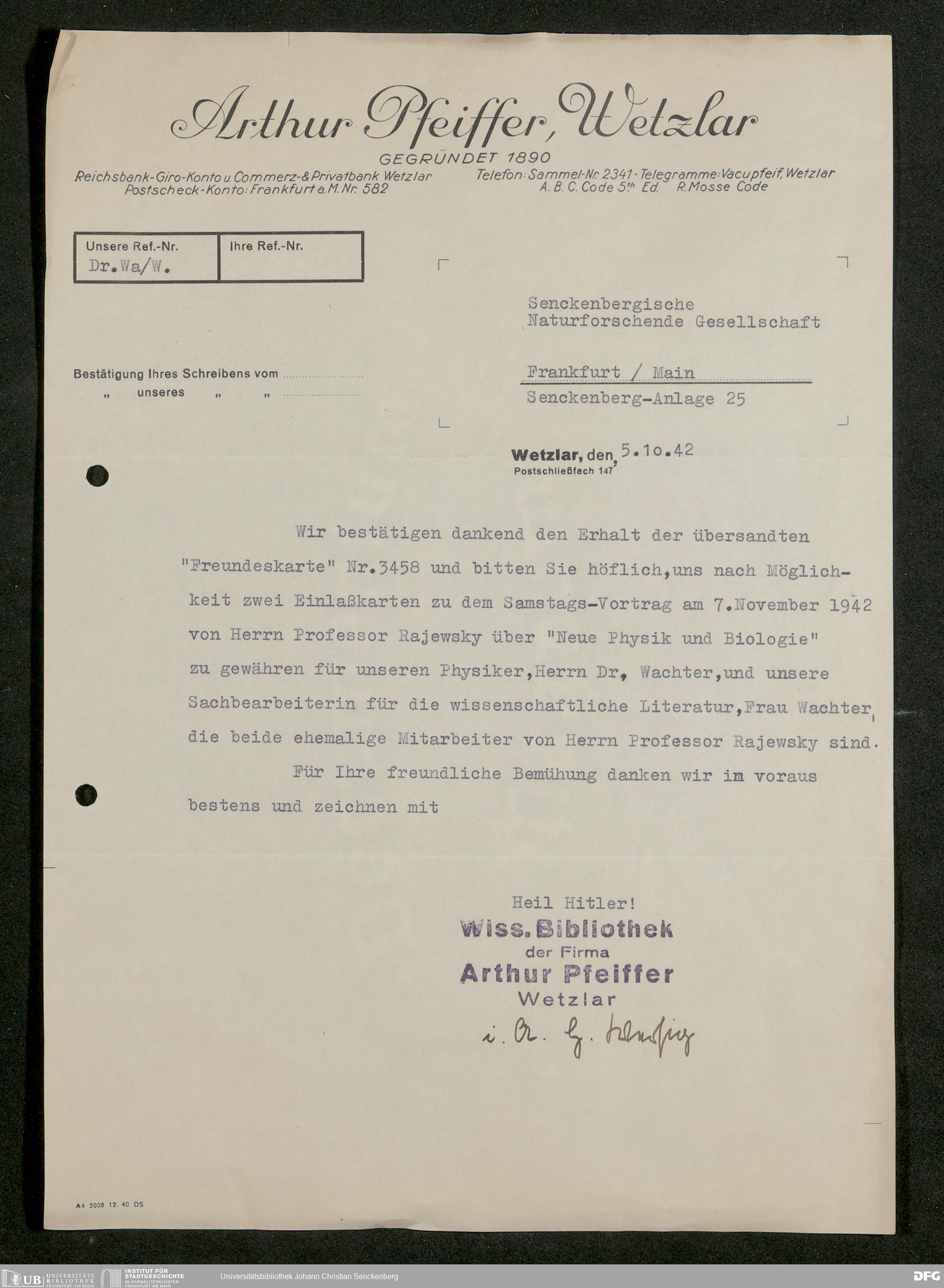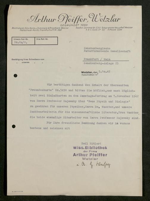 V176 Senckenberg Gesellschaft für Naturforschung, 641 - Vergabe von Freikarten zur Vorlesungen und Vorträgen der Senckenbergischen Naturforschenden Gesellschaft an Firmen, Lazarette und Schulen