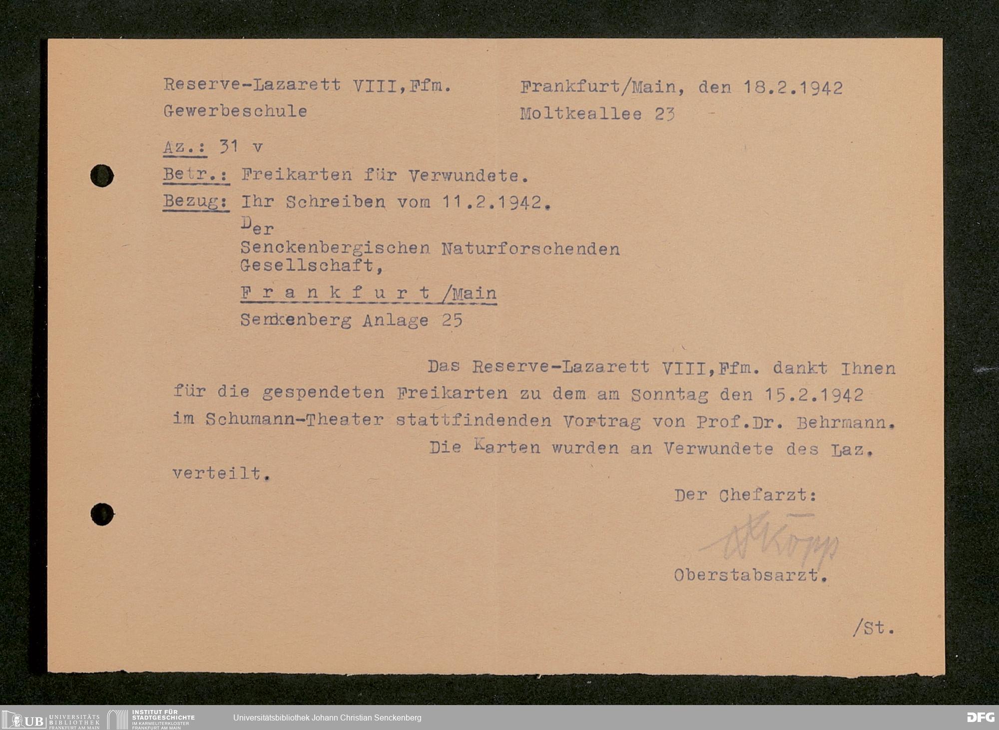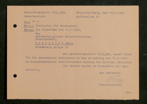 V176 Senckenberg Gesellschaft für Naturforschung, 641 - Vergabe von Freikarten zur Vorlesungen und Vorträgen der Senckenbergischen Naturforschenden Gesellschaft an Firmen, Lazarette und Schulen