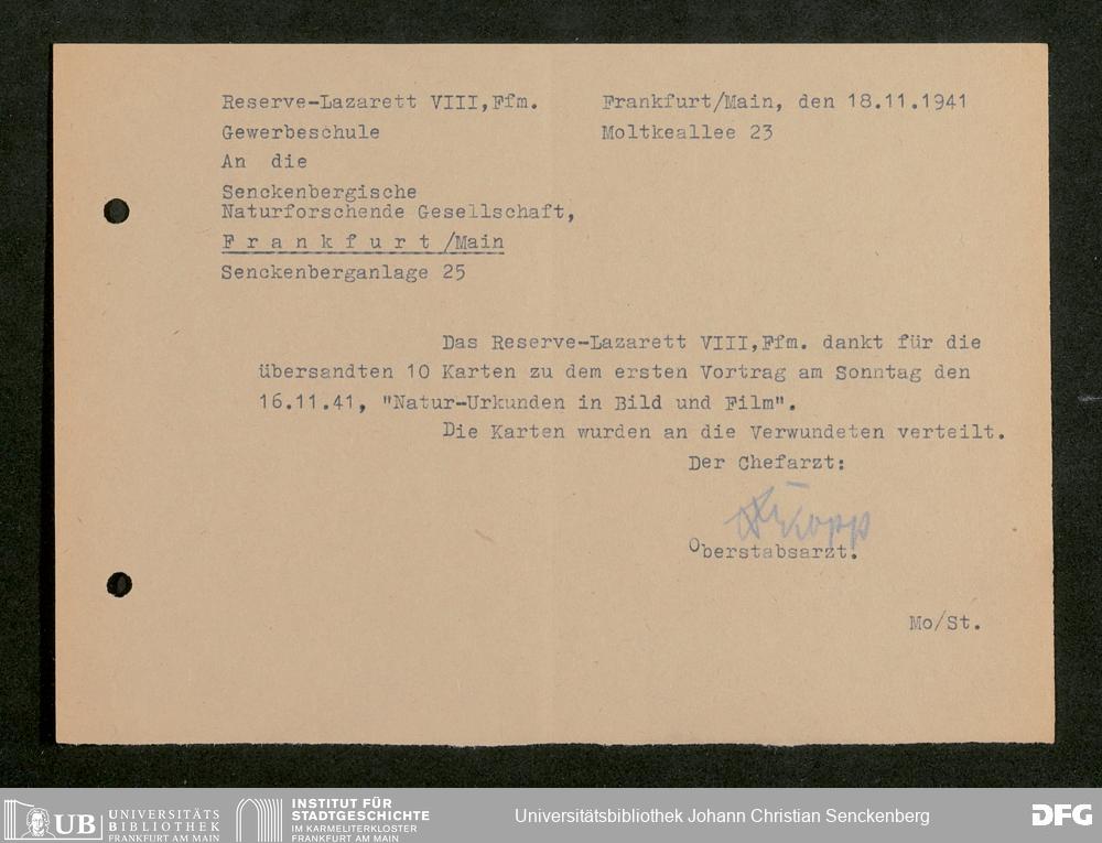 V176 Senckenberg Gesellschaft für Naturforschung, 641 - Vergabe von Freikarten zur Vorlesungen und Vorträgen der Senckenbergischen Naturforschenden Gesellschaft an Firmen, Lazarette und Schulen