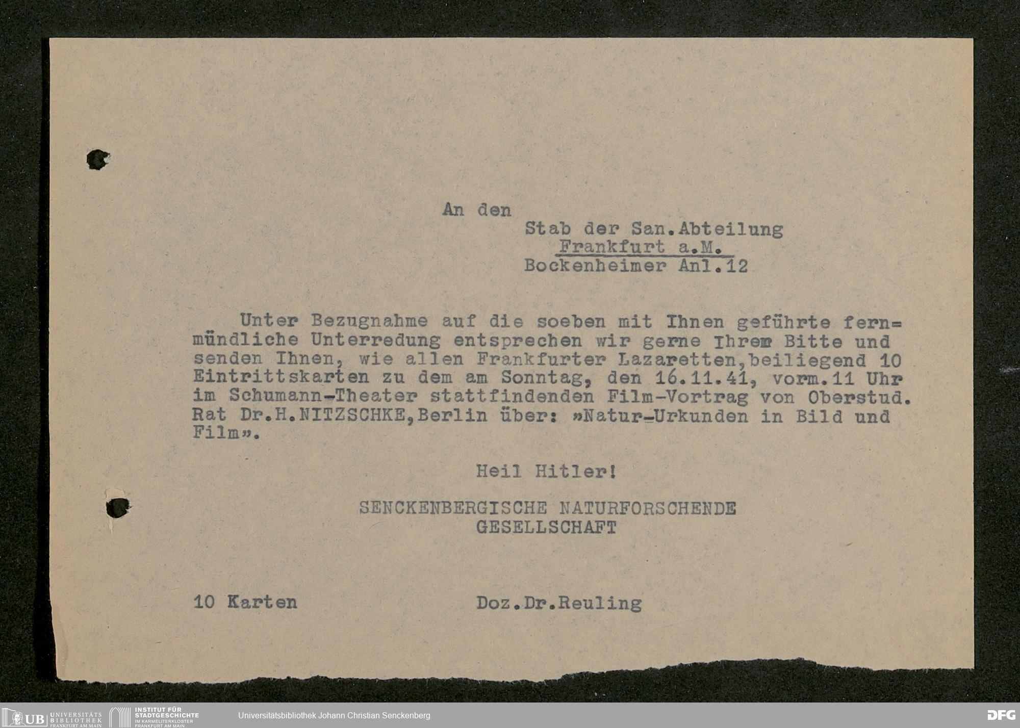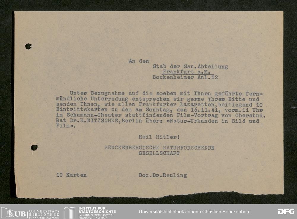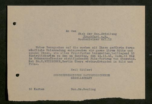 V176 Senckenberg Gesellschaft für Naturforschung, 641 - Vergabe von Freikarten zur Vorlesungen und Vorträgen der Senckenbergischen Naturforschenden Gesellschaft an Firmen, Lazarette und Schulen