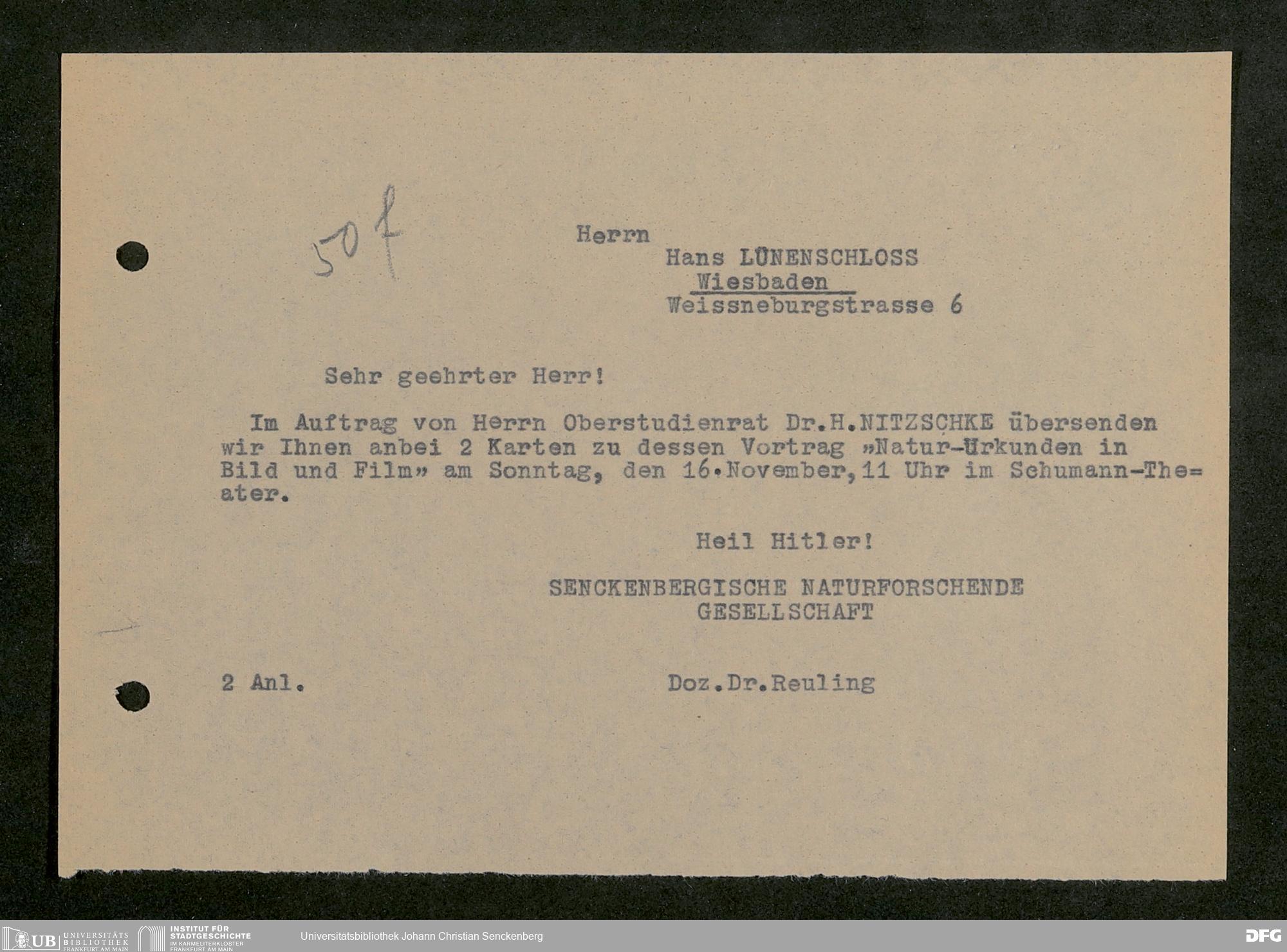 V176 Senckenberg Gesellschaft für Naturforschung, 641 - Vergabe von Freikarten zur Vorlesungen und Vorträgen der Senckenbergischen Naturforschenden Gesellschaft an Firmen, Lazarette und Schulen